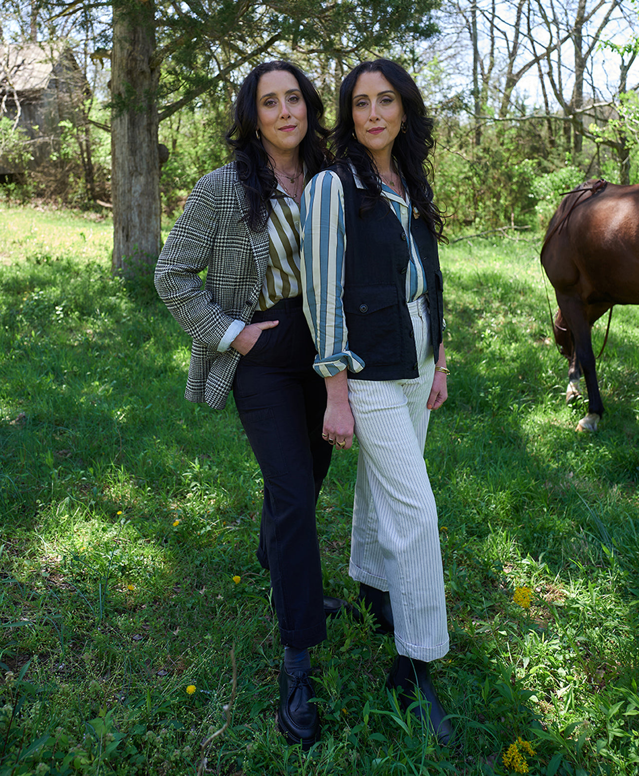 Chandra (left) wears The Italian Linen Silk Sport Coat in Cream Glen Plaid, The Rayon Hollywood Shirt and The Italian Relaxed Utility Pant. Leigh (right) wears The Linen Utility Vest, Rayon Hollywood Shirt and The Relaxed Striped Denim Chino