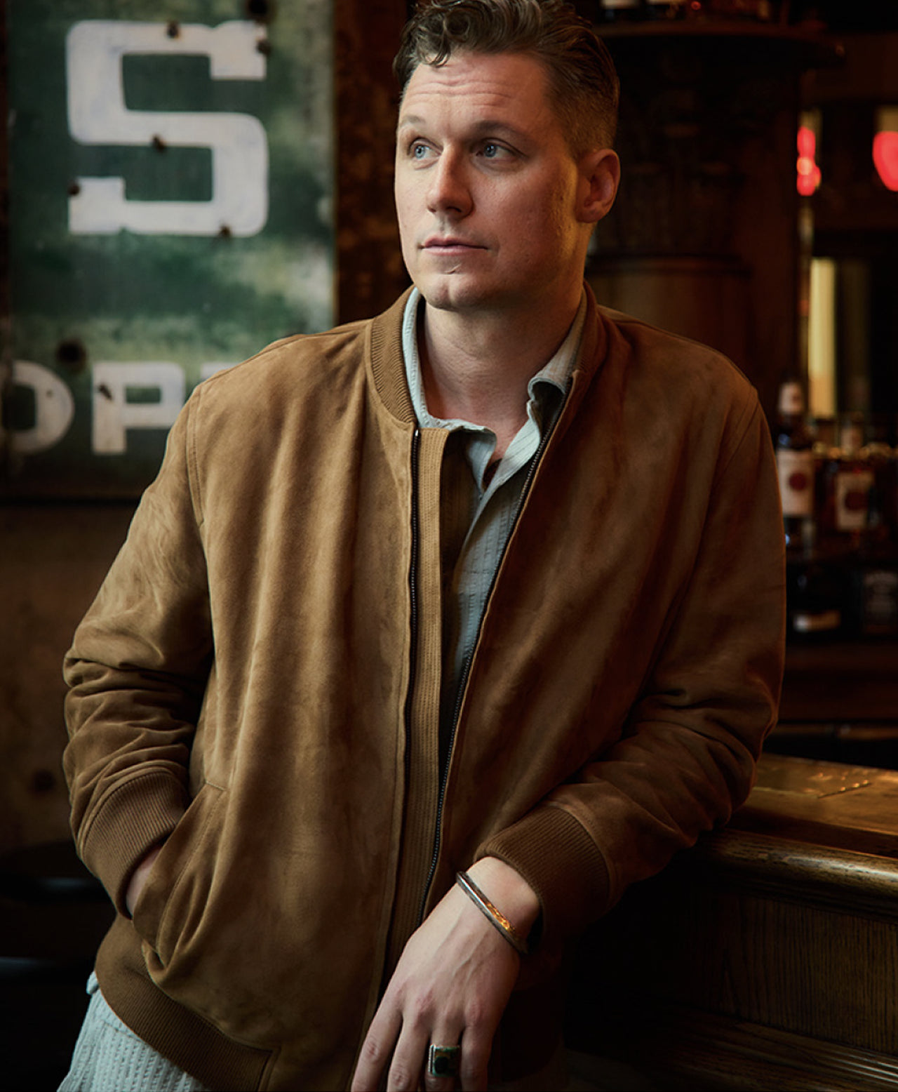 Nick wears The Italian Suede Snap Dylan Jacket, The Japanese Selvedge Jean and The Tuscan Low Profile Sneaker