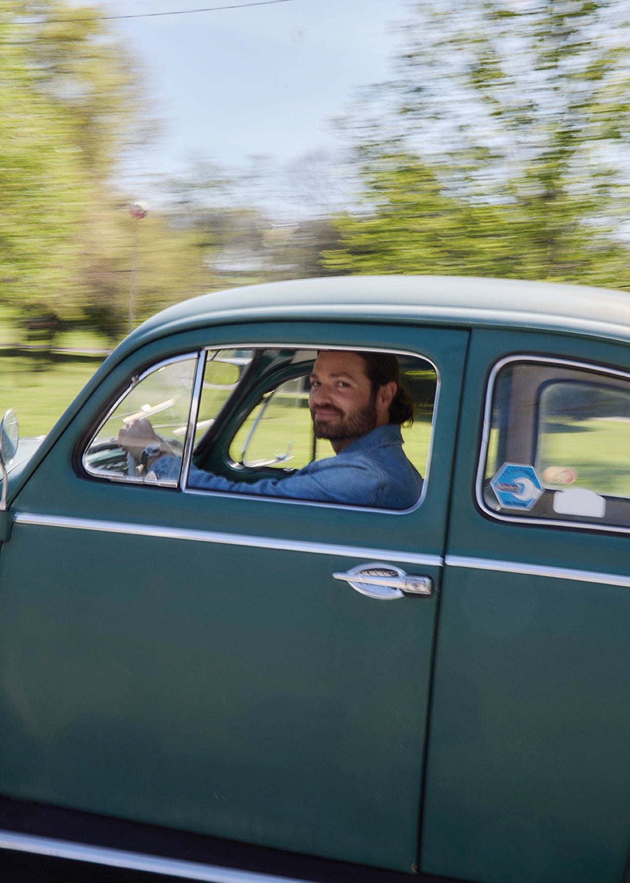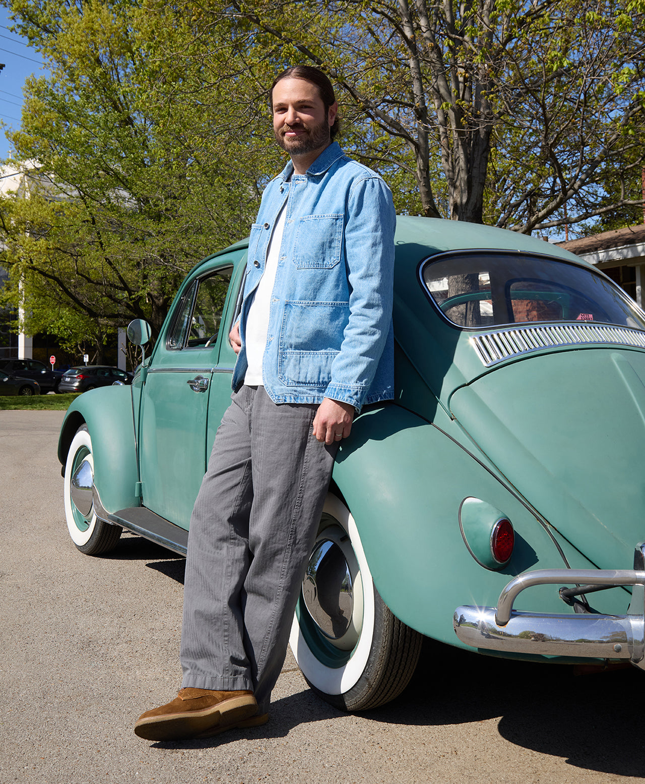 Cameron wears The Denim Engineer Coat, The Italian Relaxed Gurkha Trouser and the 1959 VW Beetle is his.