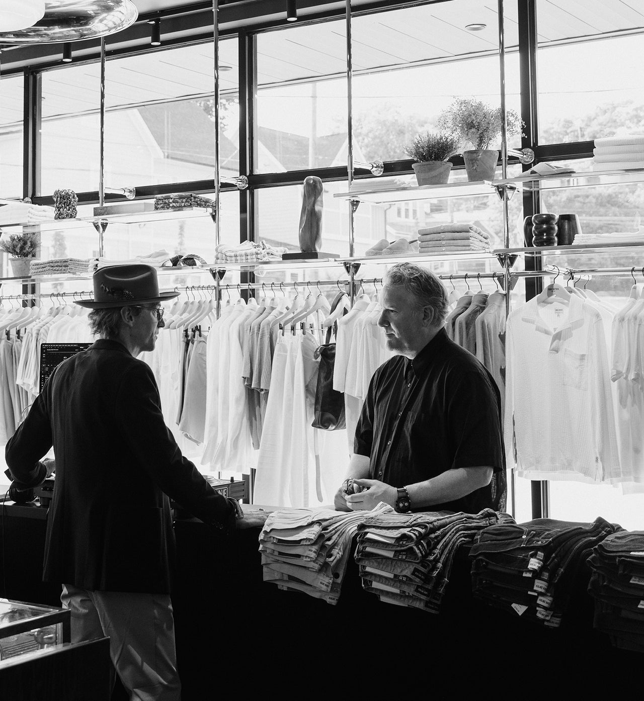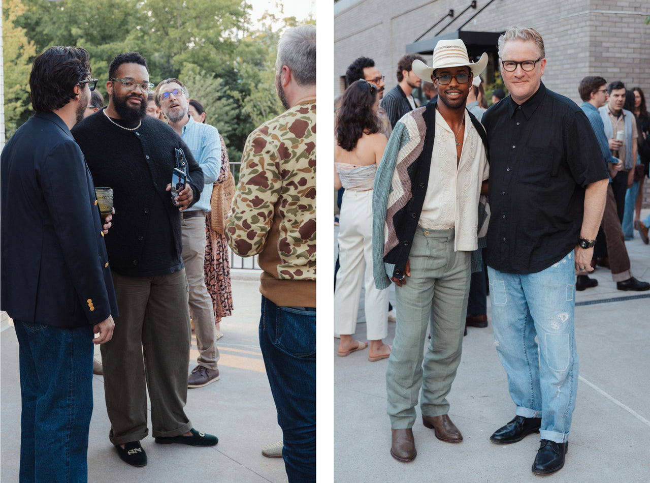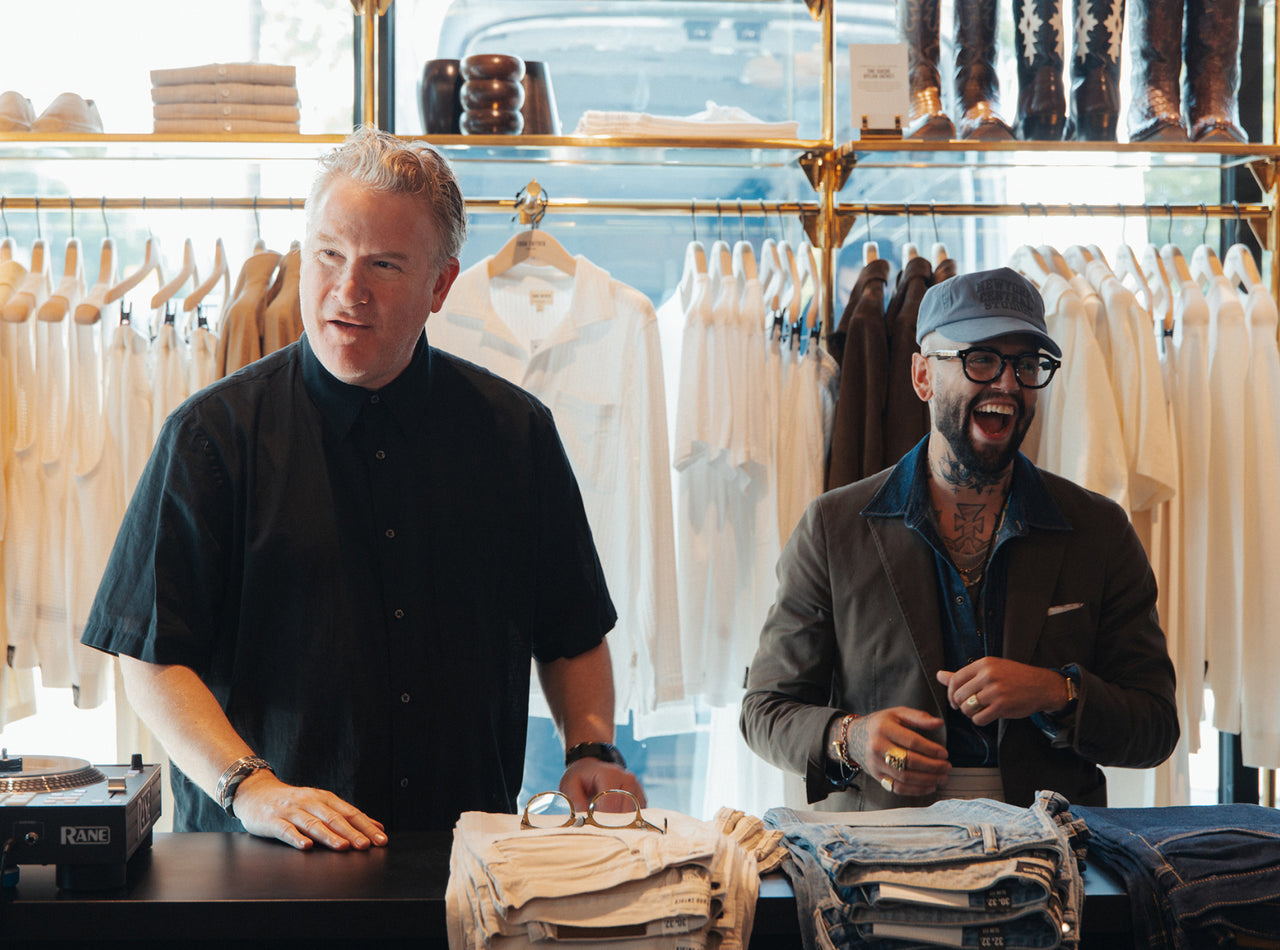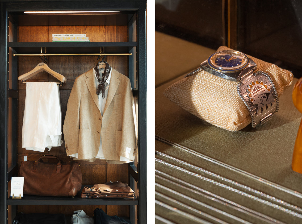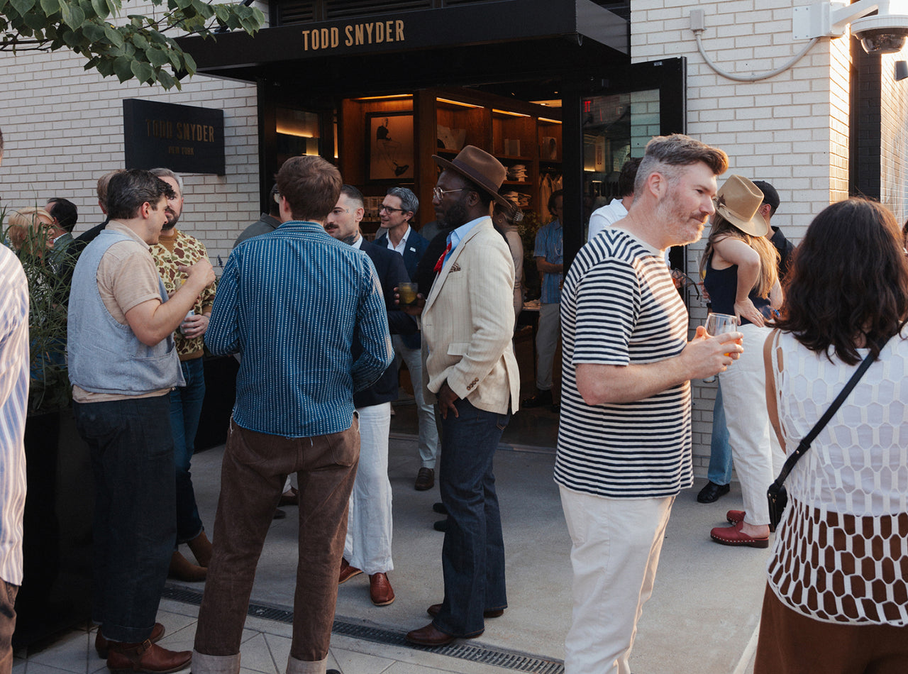 After a day of vintage shopping at Eneby Home, High Class Hillbilly, Grimey’s Records and a fortifying “meat-and-three” at Arnold’s Country Kitchen, Todd officially opened our new store at 12 South with a bash for friends, customers and local tastemakers. The 2,700-square-foot space merged the relaxed warmth and hospitality of the South with British touches. At the heart of the store is a custom marble fireplace complemented by chocolate mohair and burlwood deco chairs, with original artwork from Ryan McMenamy. In addition to the award-winning Todd Snyder collection, the store highlights a carefully chosen array of best-in-class brands from around the world, including Nashville-based Weiss Watches, Rubinacci loafers, New Balance, and vintage luxury timepieces and jewelry in collaboration with Foundwell.