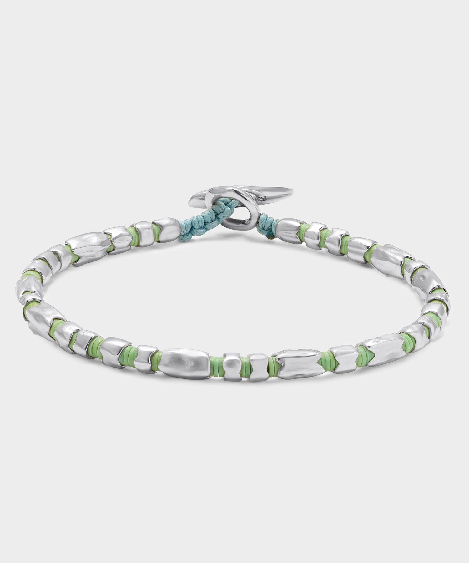 Expertly crafted with 925 sterling silver and adorned with beautiful African vinyl beads, the Dryp 2 Bracelet in Mint Green adds a touch of elegance to any outfit. Handmade with care, this bracelet is a unique blend of style and culture.