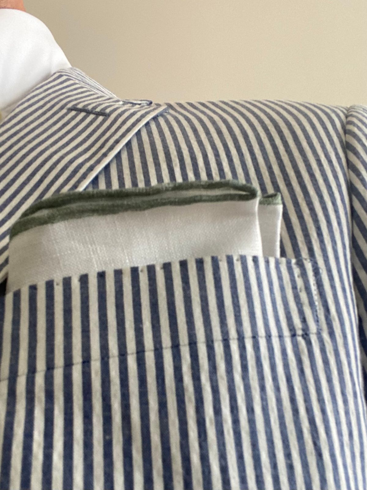 Sits well in a sport coat and is a great summer addition. The green border pod with green five picket denim and seersucker sport coat.