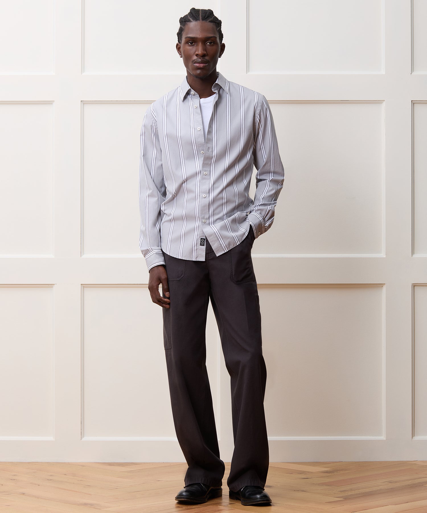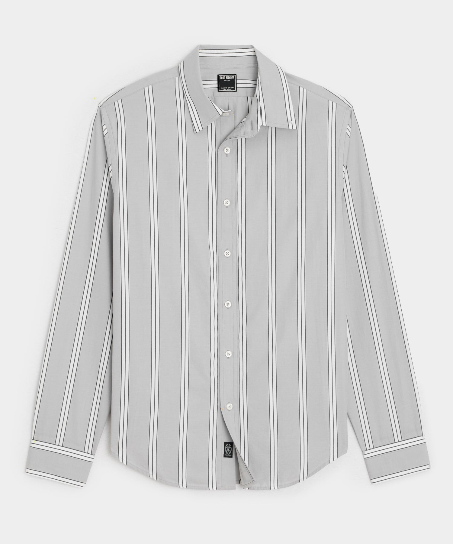 Grey strip poplin collared shirt on sale. I had wanted to buy it in the early part of the season but passed...then bought it at the end of the season';s final sale. Good looking shirt but the poplin material prevents it from a normal casual fit or in more of a preferred relaxed manner. Still a good looking shirt but hoping that it might relax more with wear.