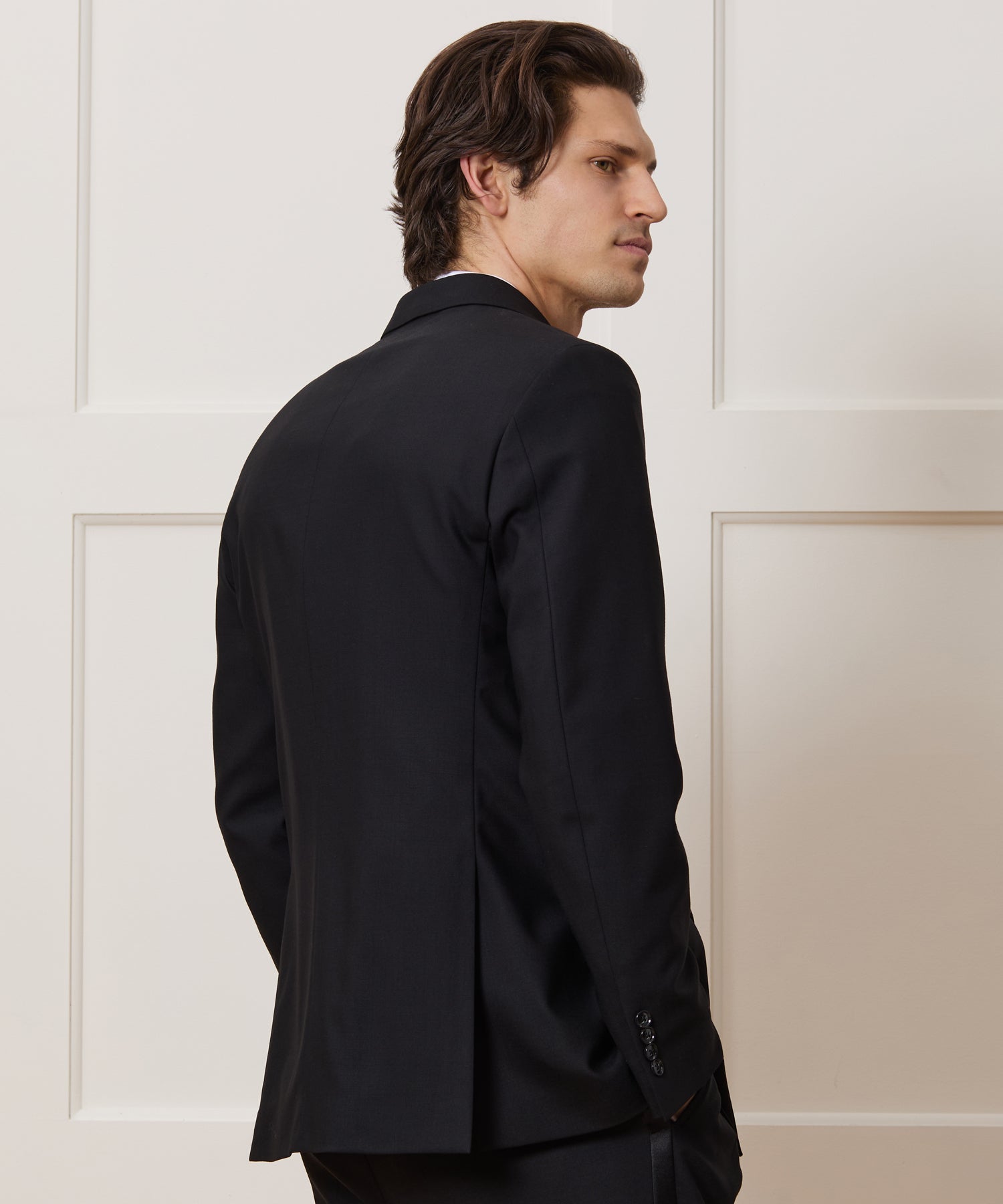 An essential for the sharp dresser, our luxurious tuxedo is crafted in a handsome wool from the renowned Italian mill, Tollegno 1900. Premium details include a wide satin peak lapel and genuine black horn buttons.