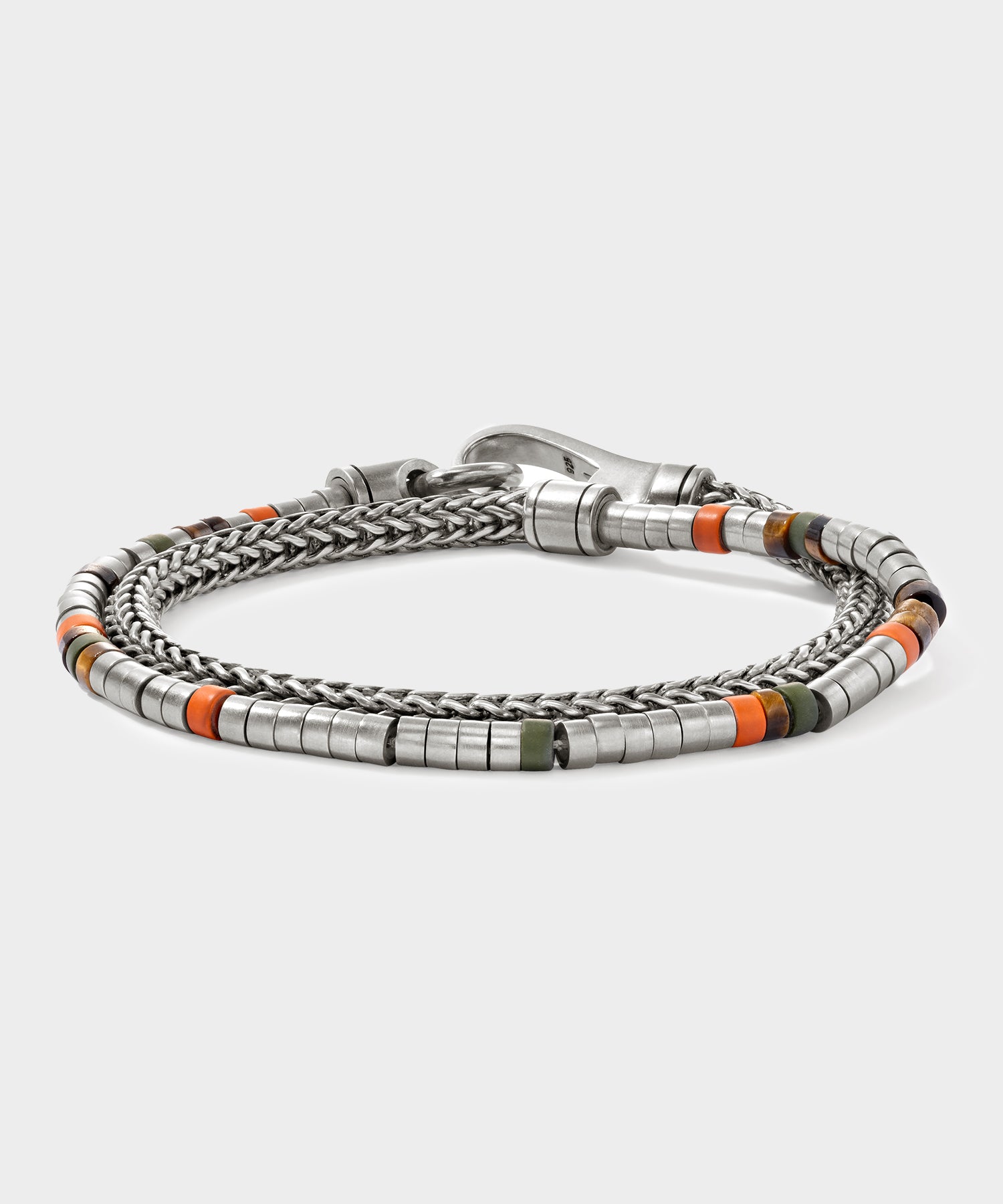 Reed Krakoff — the Creative Chairman of this storied jewelry brand — unveiled his first men’s collection in Spring 2024: chic rings, necklaces, earrings and bracelets, made by hand by Hardy artisans, using 100% reclaimed precious metals. Todd worked with the Hardy team to design this limited-edition, nautical-inspired collection. This Double Wrap Bracelet features a band that’s half reclaimed sterling silver chain and half beads — orange and green enamel and the gemstone tiger’s eye.