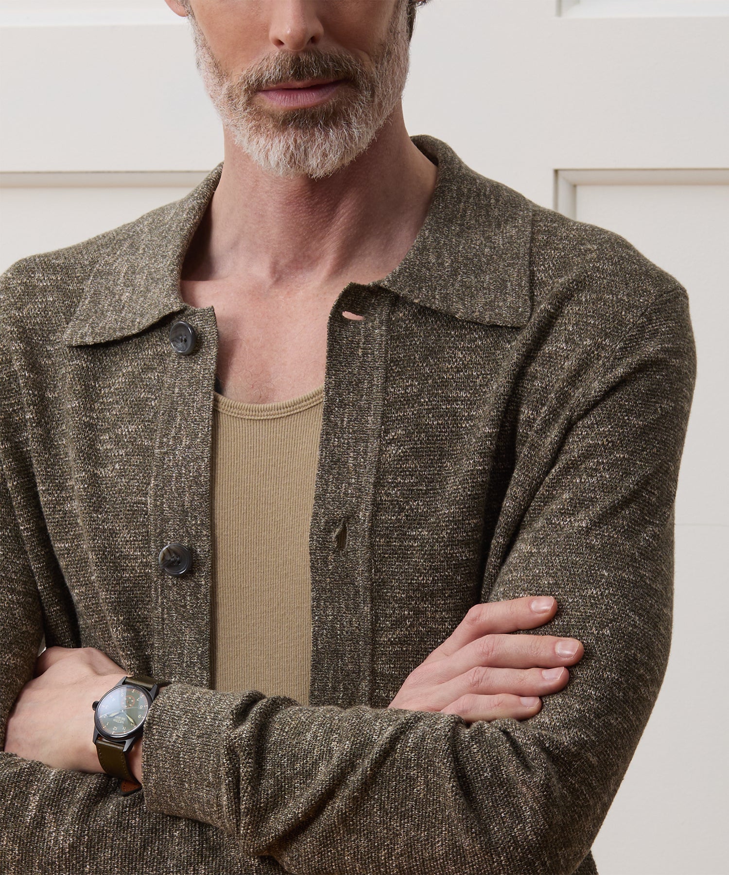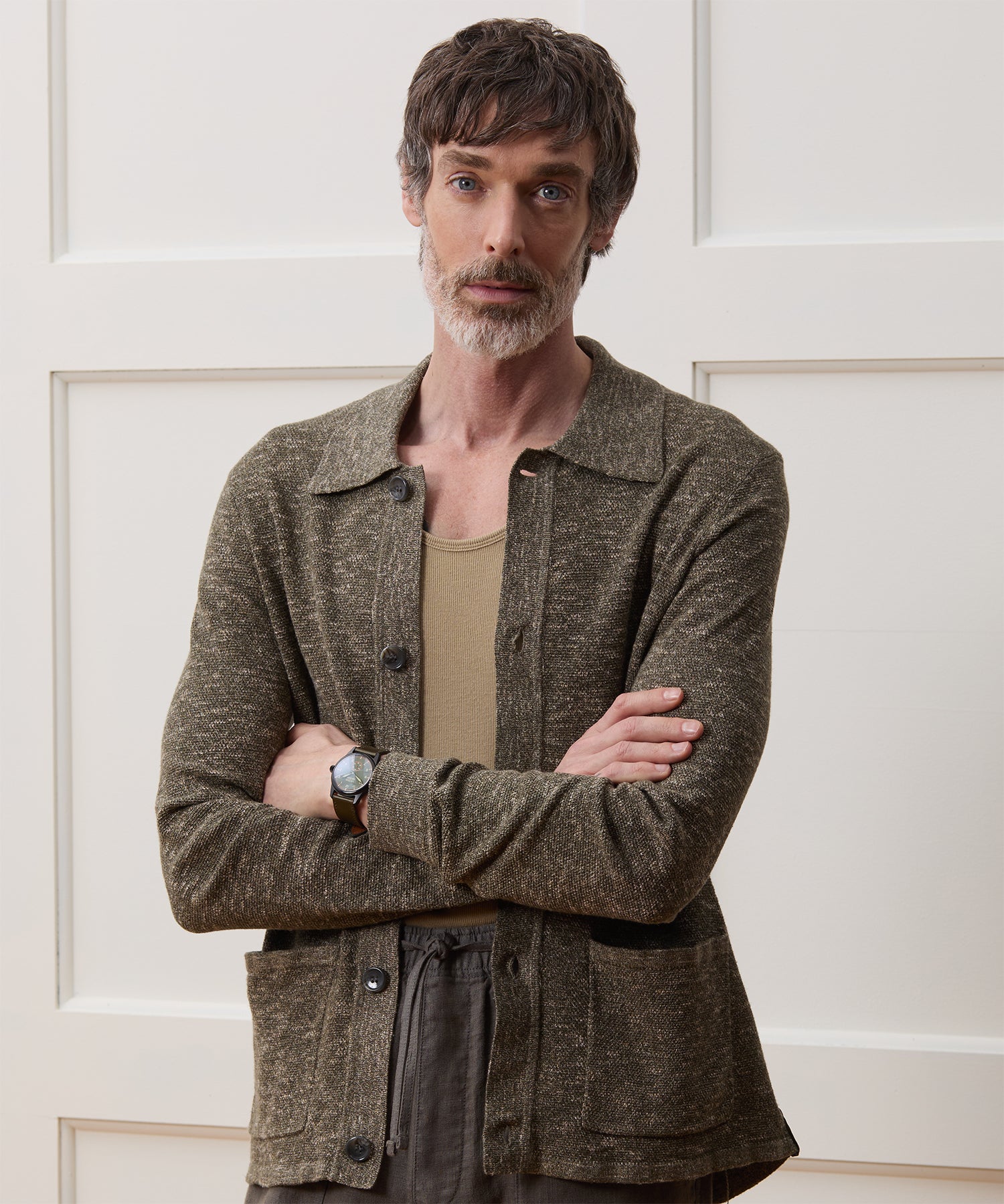 The term “pub jacket” was first coined by Murray Pearlstein, founder of iconic menswear store LOUIS Boston, to describe this cardigan-meets-chore-coat. Our Shore Pub Jacket is knit from an Italian cotton-linen yarn that’s a “mouliné,” which is made by twisting two different colors of yarn together before weaving to create a chic, marbled effect. In this case, it adds flecks of white to the charcoal and green; the heathered visual texture is complemented by the slubby texture of the yarn, which is knit in a small seed stitch. With an easy fit, two hand pockets and a clean tubular hem, it’s an endlessly versatile layer that’s easy to dress up or down as the occasion calls for.