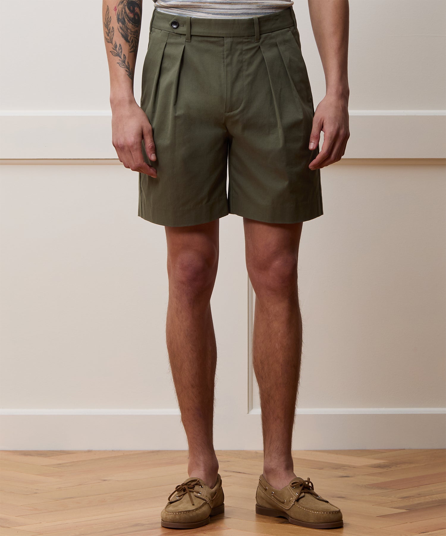 Our Pleated Tab Short is inspired by our bestselling Wythe Trousers, with a modern, oversized but tailored fit. The silhouette features a belt loop waist with an extended tab closure, and the volume up top is kept in check with double reverse pleats (which face out, away from the fly). A mid-length 7” inseam and a slightly taller rise gives these a classic feel, and they’re versatile enough to wear them higher on your waist or lower on your hips. They’re made from a handsome Italian cotton fabric with just a hint of stretch in it, for comfort. Because of their tailored details, these shorts can dress up a casual look or dress down a formal one — in other words, they’re perfect for beach weddings and other summer events.