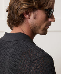 This vintage-inspired polo is made from a lightweight silk-cotton yarn for a soft, easy-to-wear finish, in a pointelle stitch that gives it a plush texture. Light, airy, and slightly cropped, it’s the perfect pick to wear solo, or untucked and unbuttoned as a light layer over a tee or tank. Another detail we love: the real shell buttons at the placket and clean styling throughout.