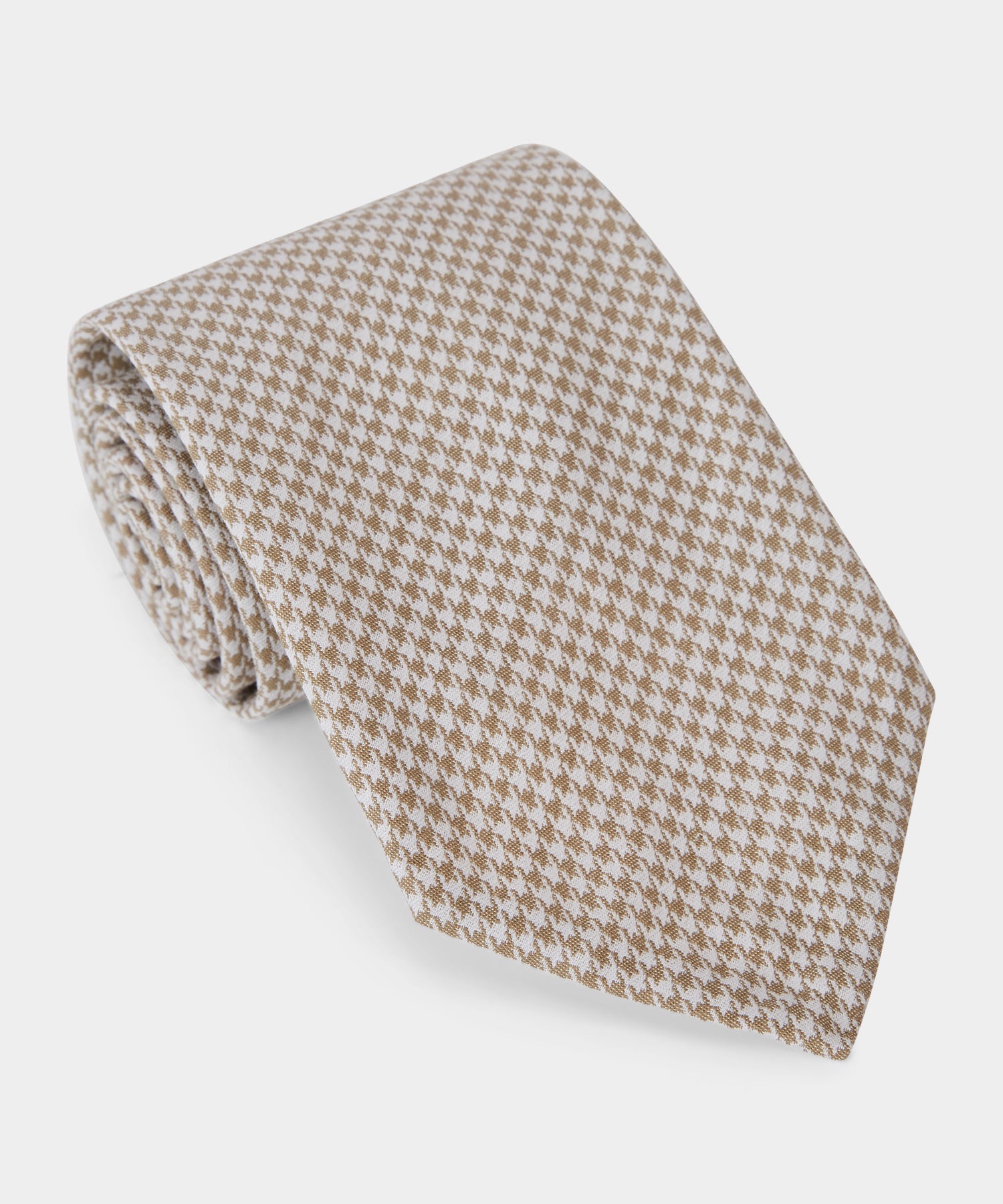 Our hand-stitched and untipped ties are constructed in Italy, and pair perfectly with any suit, sport coat or jacket. This particular tie is made from a blend of linen and cotton, in a classic beige houndstooth pattern.