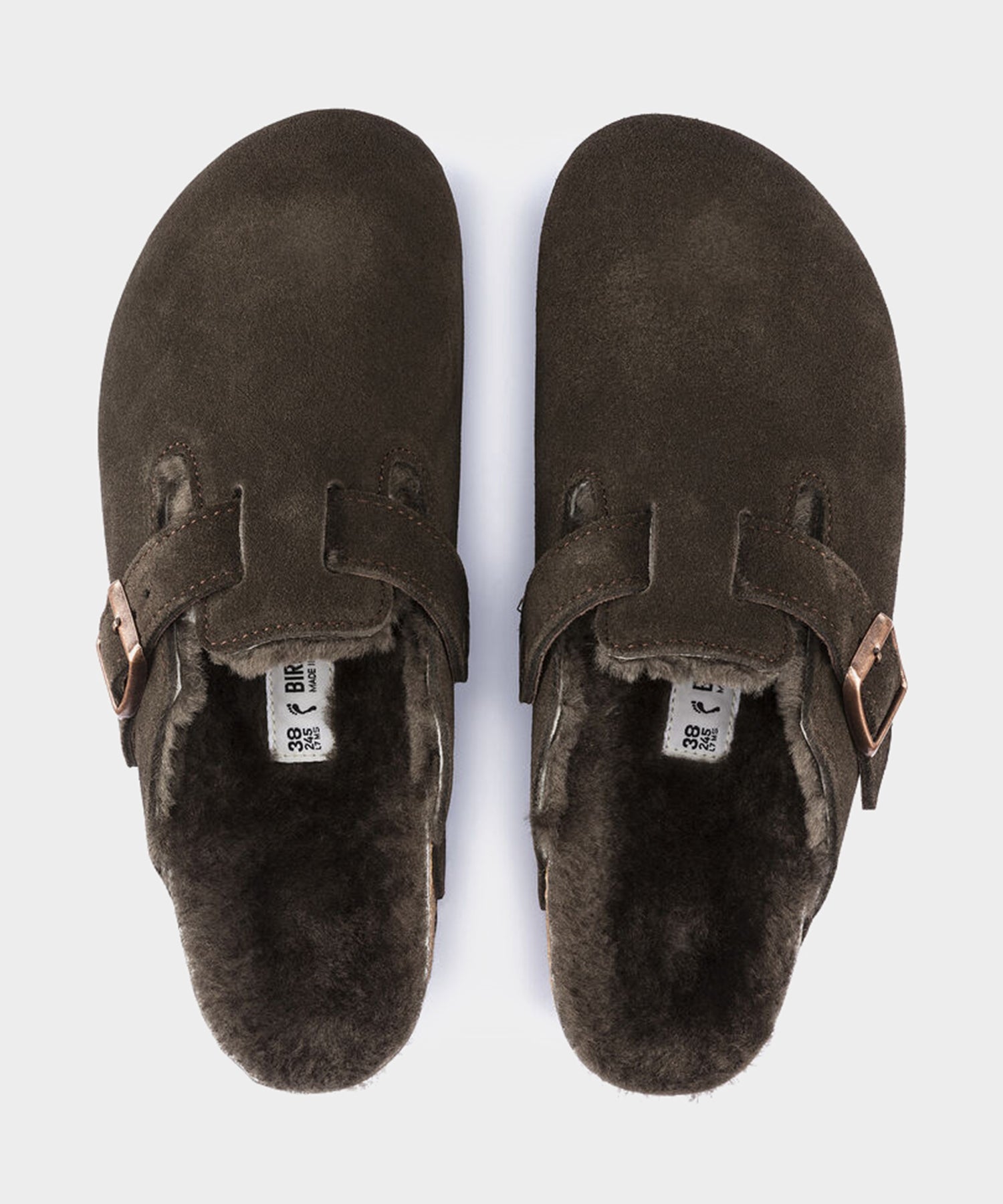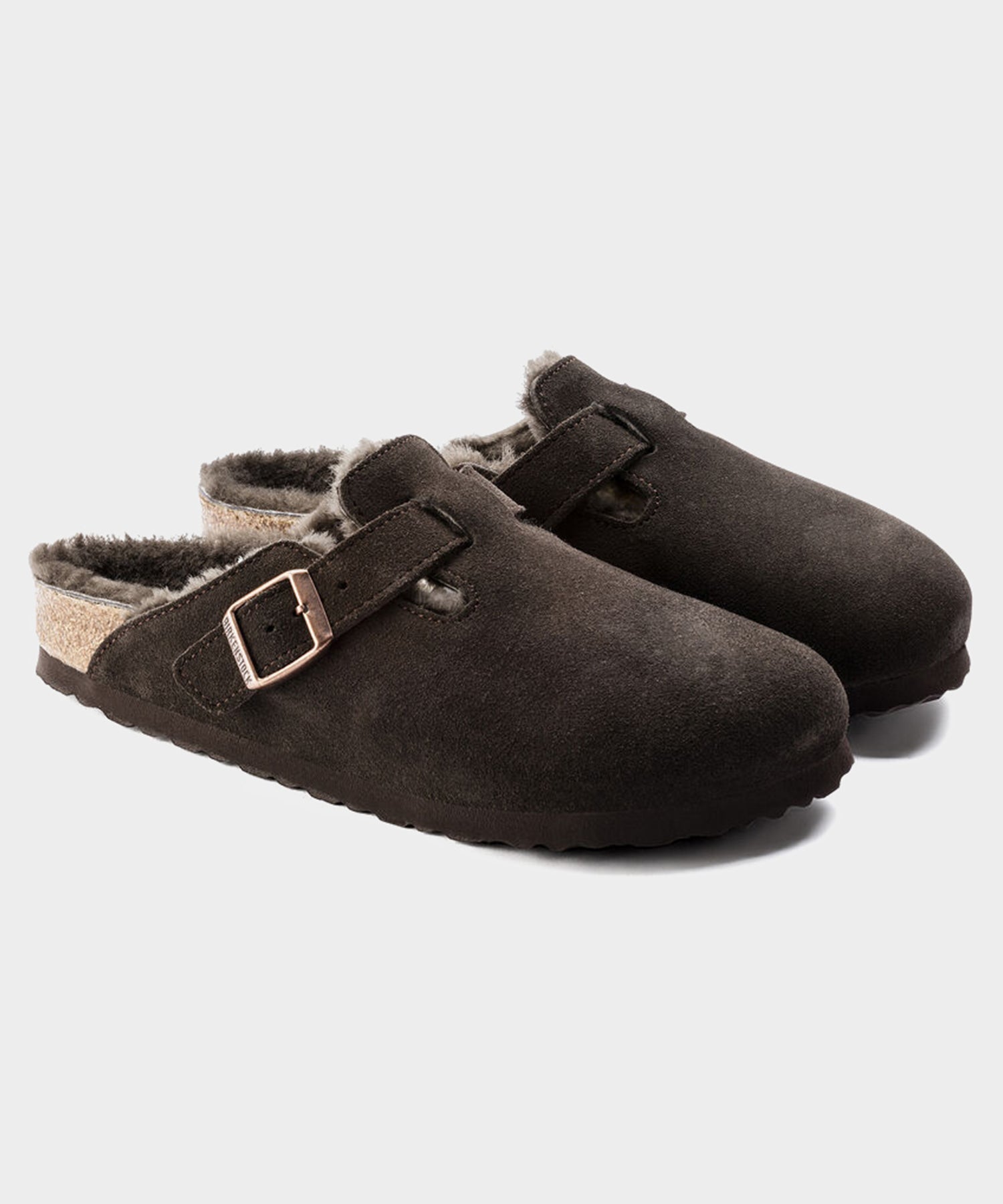 The bolder, the better! This exceptionally cozy version of the Boston clog, a classic BIRKENSTOCK model, is made of real, very high-quality suede. The shearling footbed and strap lining exudes style and keeps feet warm. The perfect shoe for cozy winter evenings by an open fire!