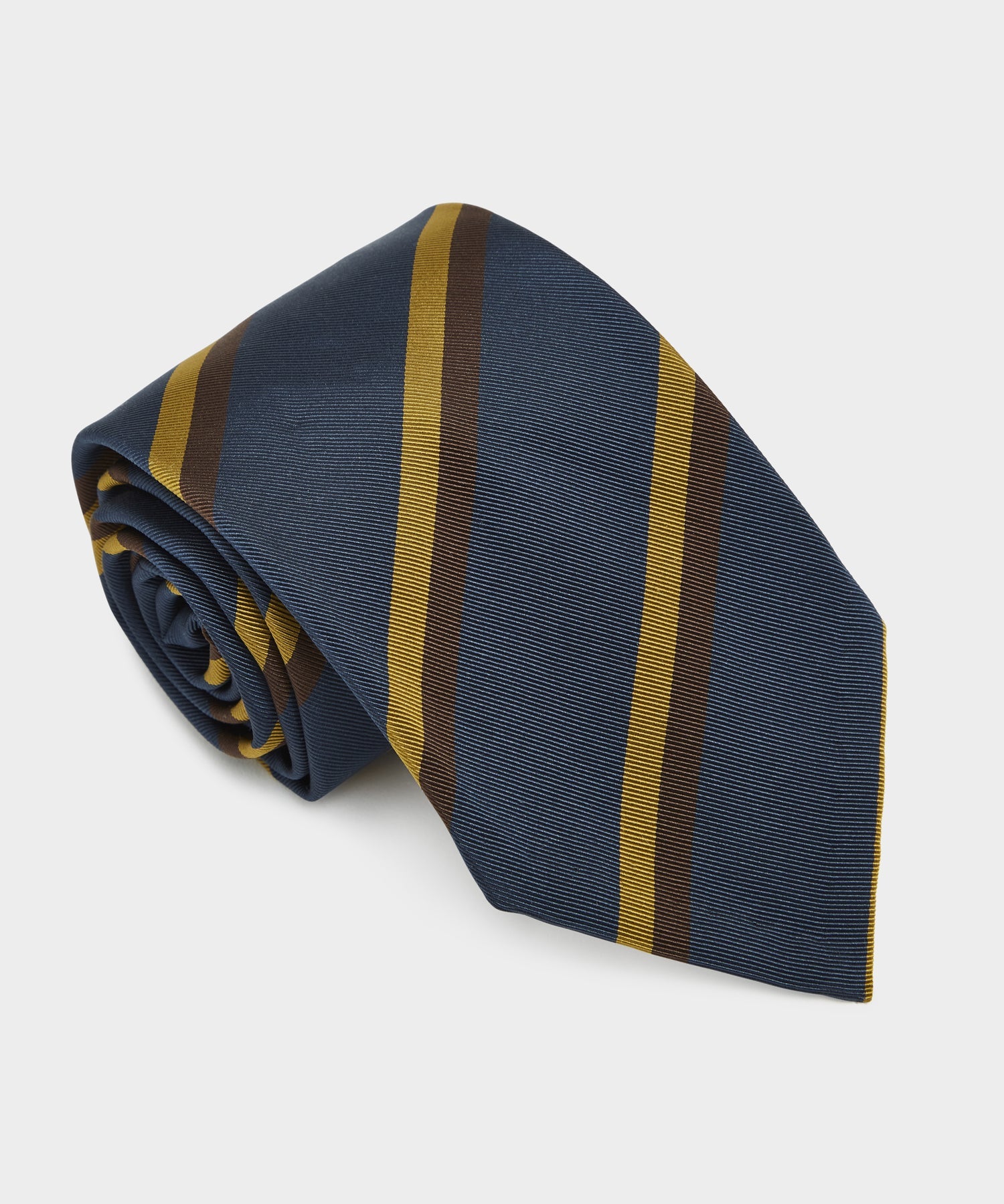 Our hand-stitched and untipped ties are constructed in Italy, and pair perfectly with any suit, sport coat or jacket. This particular tie is made with premium silk and cotton from the United Kingdom’s revered Stephen Walters mill, which has been weaving fine fabrics for over three centuries. Both timeless and contemporary, the classic blue-and-gold striped pattern is inspired by textiles in Stephen Walters’ extensive historical archives.