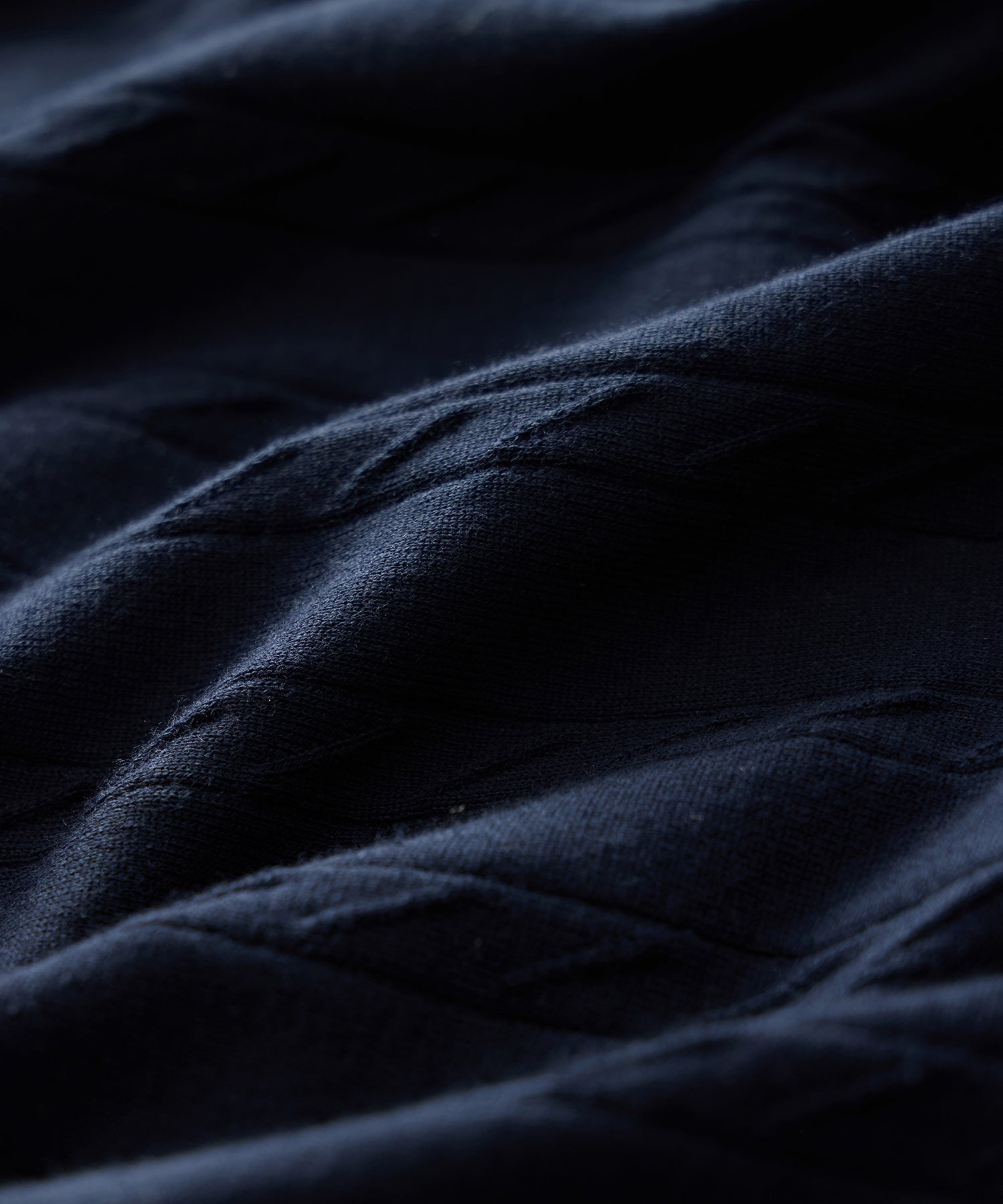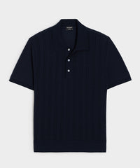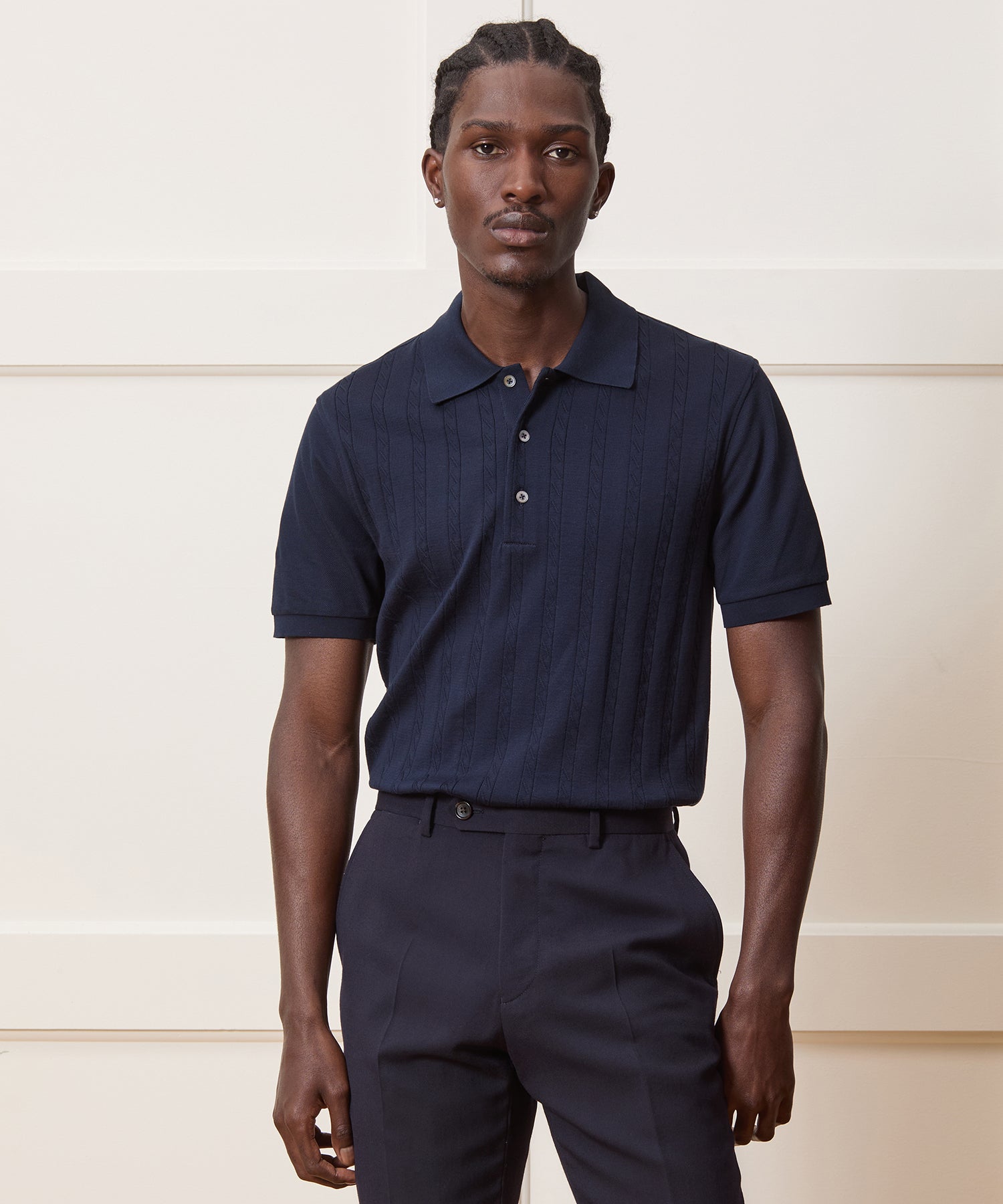 This unique polo is constructed like a sweater more than a traditional knit polo. Made from lightweight Turkish cotton, the front body features a jacquard (AKA knit directly into the fabric) stripe that resembles a fine cable stitch, while the sleeves and back are in a subtly textured pique. With an open body and classic fit, this polo looks excellent worn solo.