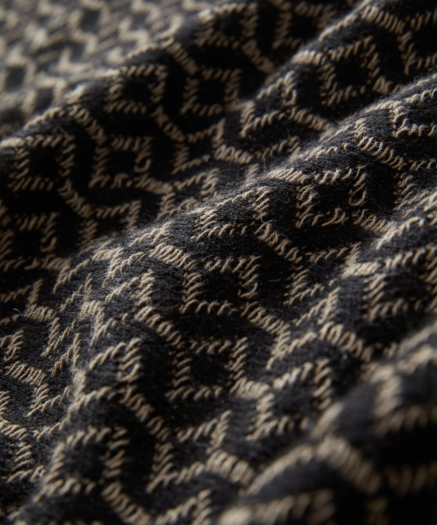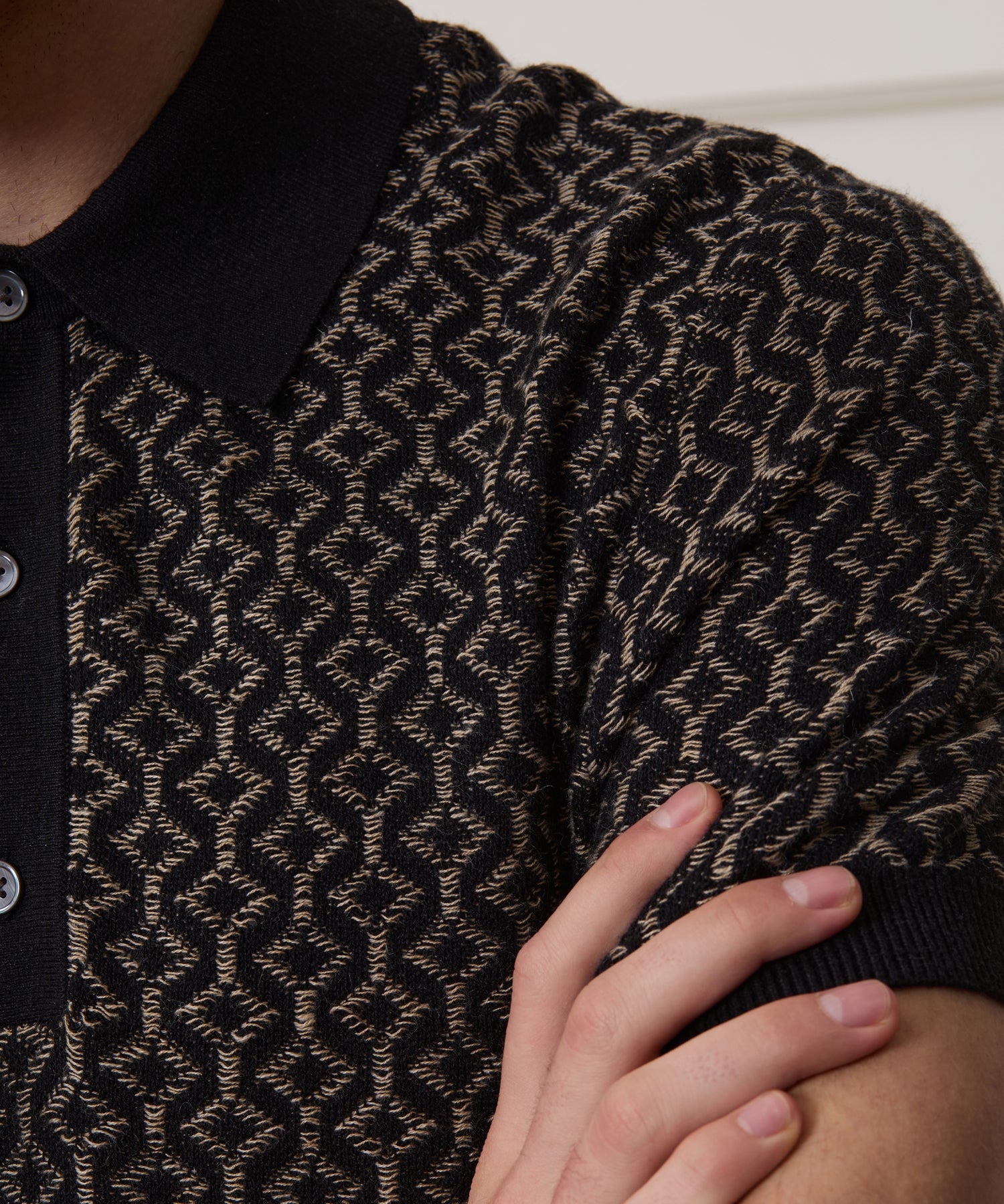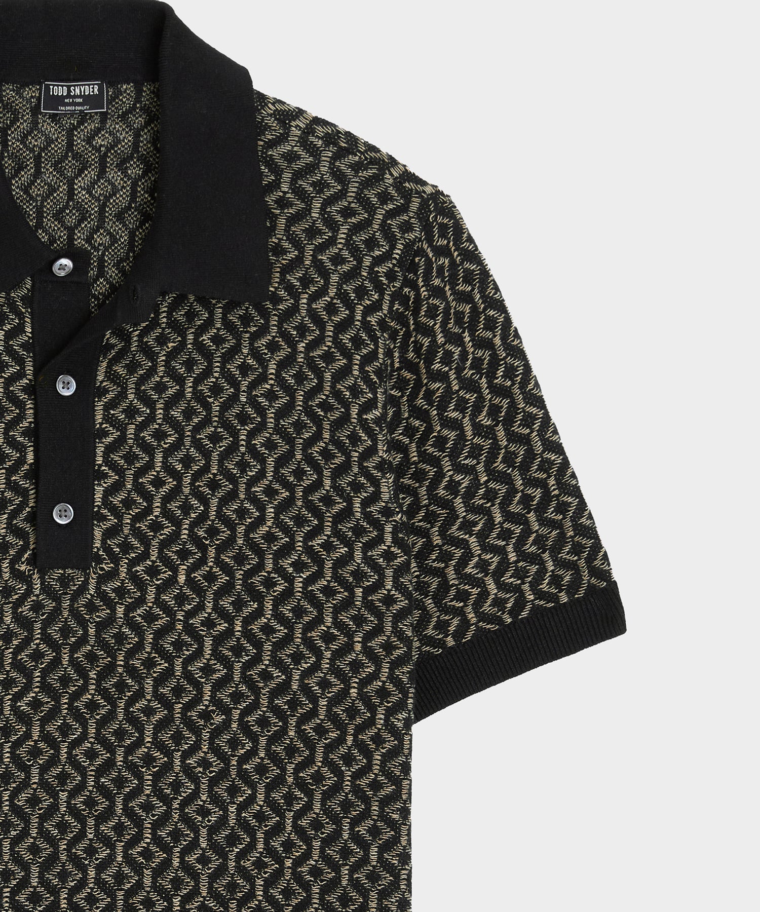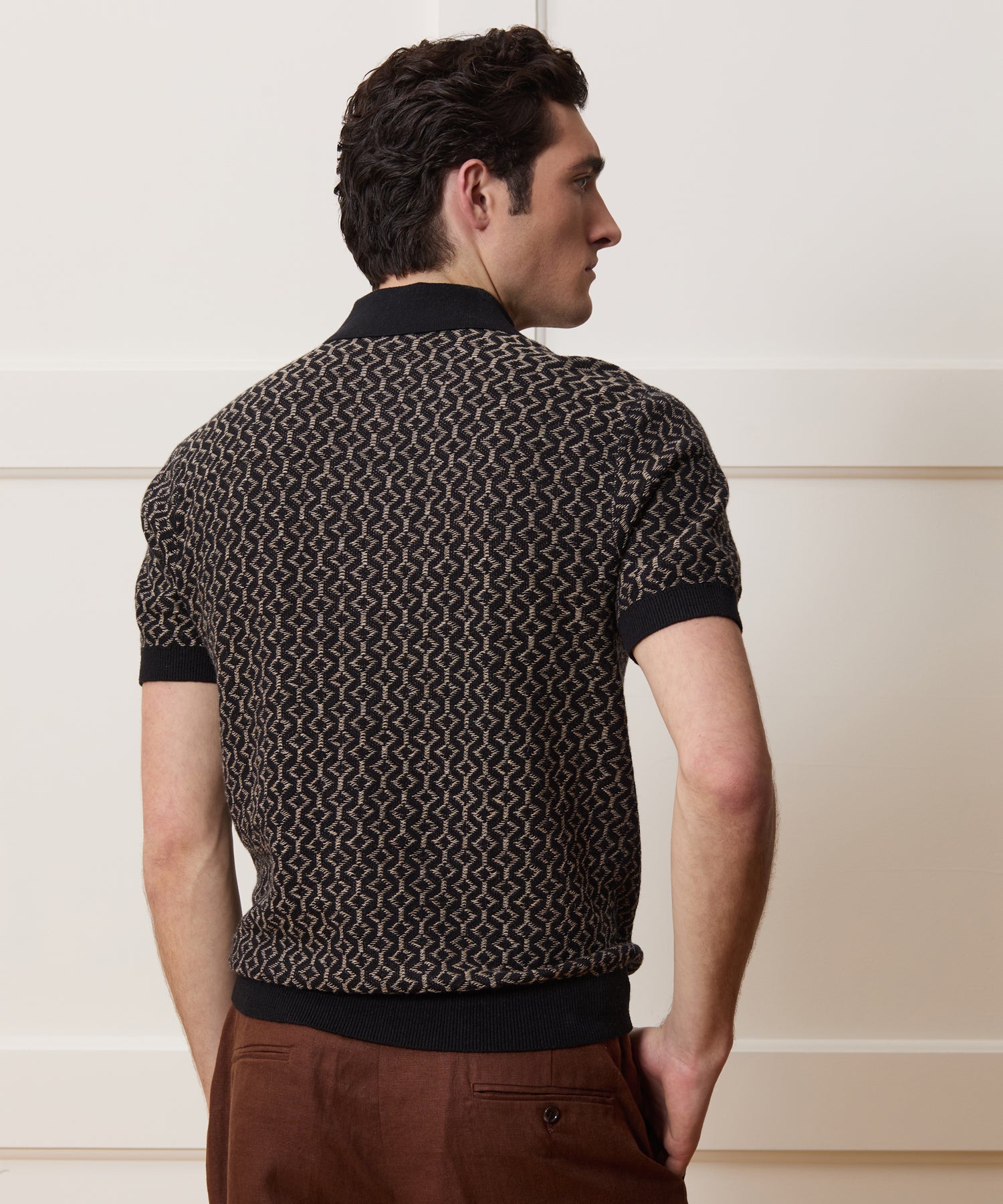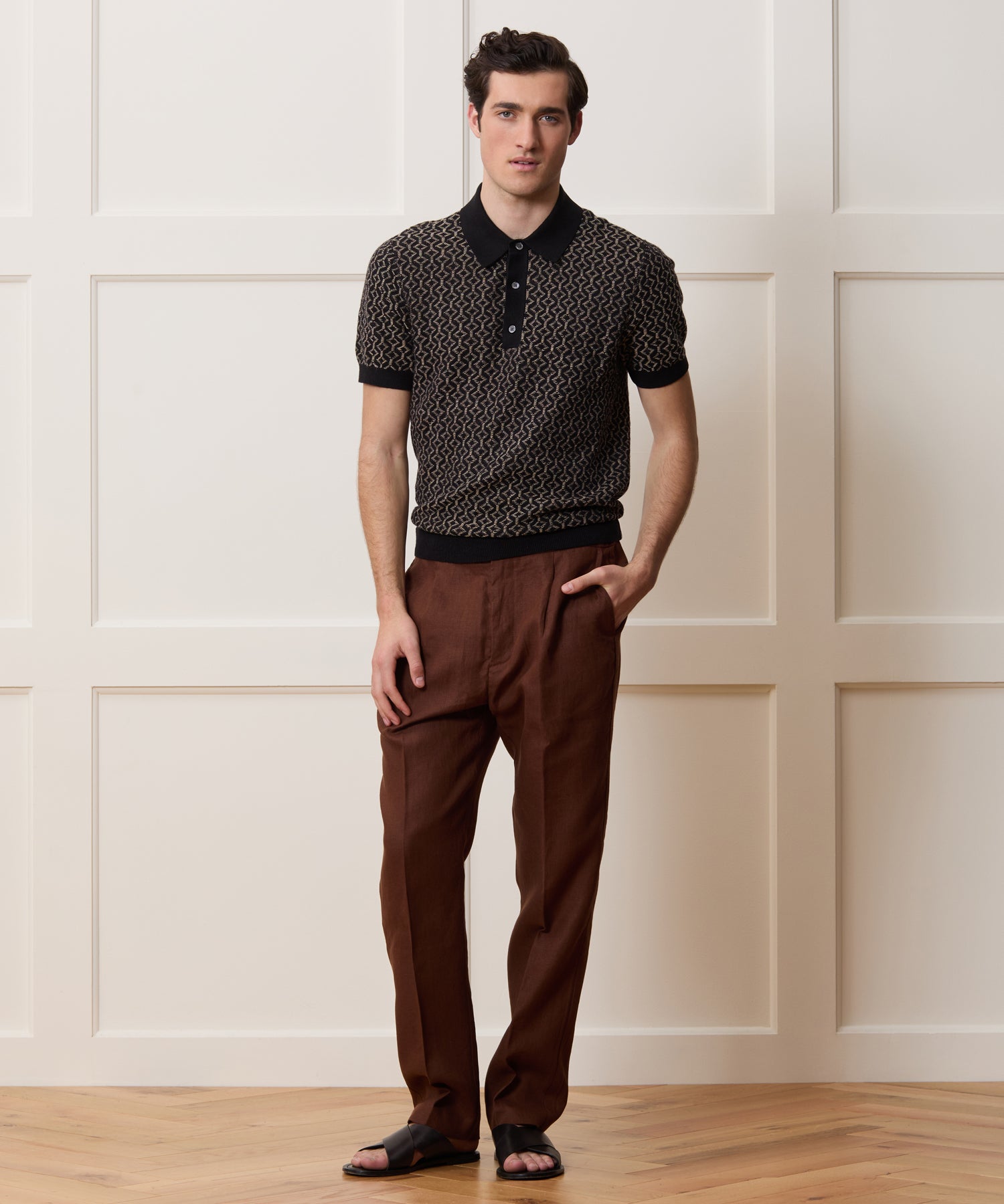 This retro-inspired Sweater Polo is knit from a lightweight blend of linen and cotton that’s breathable, but not sheer — and it won’t cling on hot days. It features a soft geometric pattern in shades of khaki and black, based on vintage rugs; it’s actually a doubleknit, but the fabric is flipped to expose the textured floats normally on the interior. The collar features a knit-in stand for structure, and sports three genuine shell buttons.