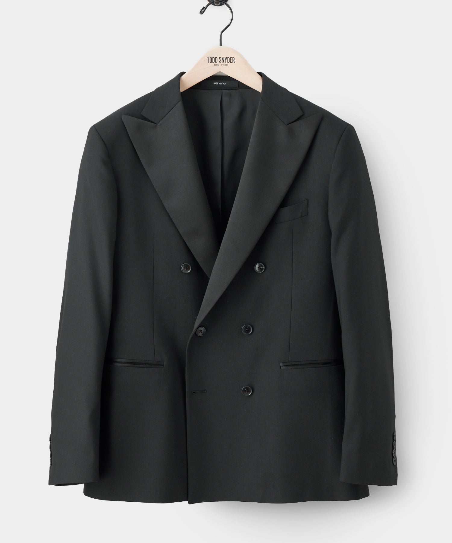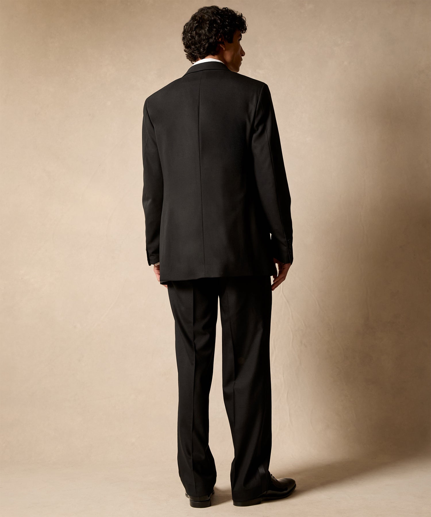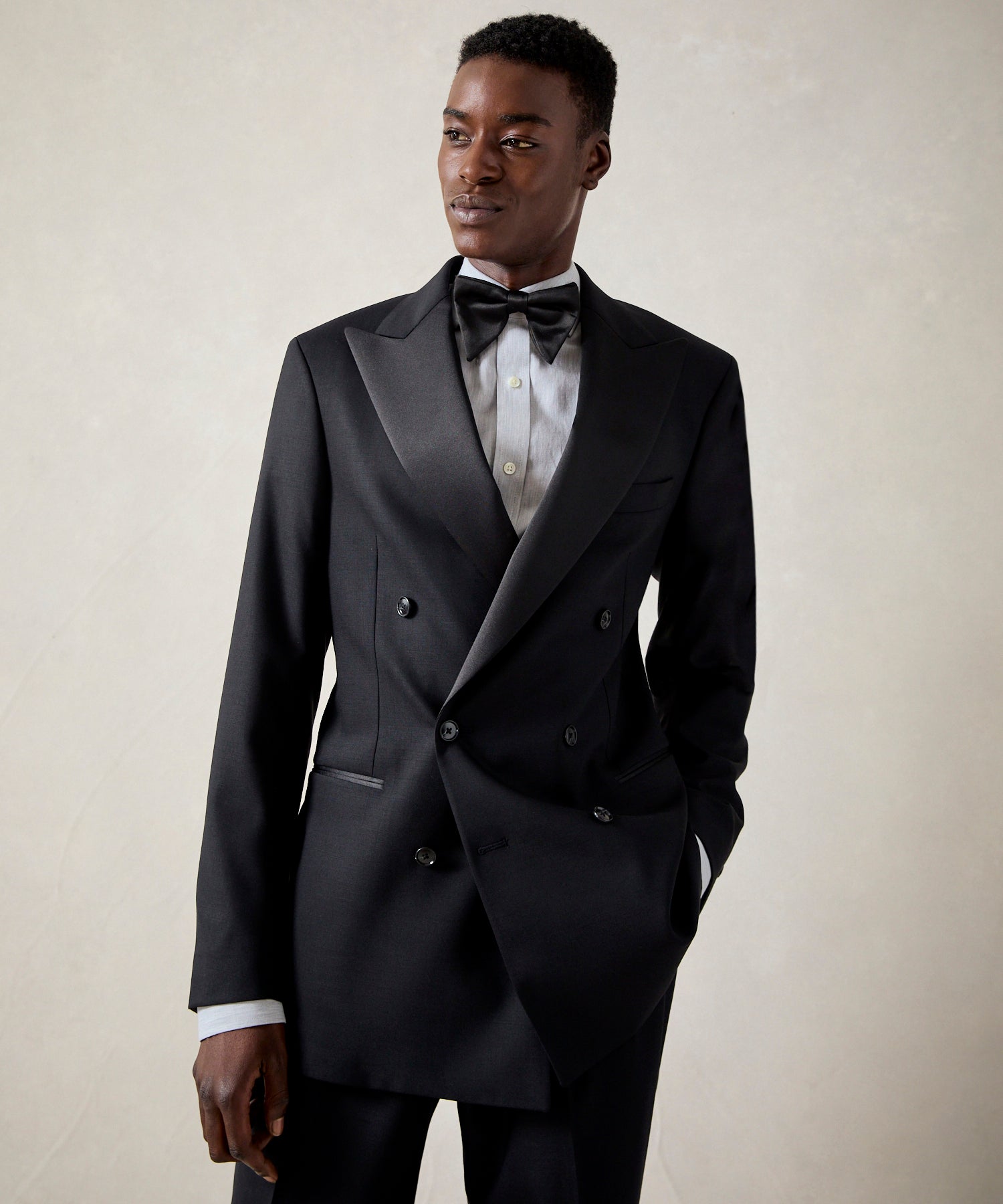 An essential for the sharp dresser, our luxurious Tuxedo Jacket is crafted in a handsome black wool from the renowned Italian mill, Tollegno 1900. This double-breasted take is a chic update on everything you love about the classic: modern, impeccable tailoring with a slim, tapered fit and a natural shoulder. Premium details include a wide satin peak lapel and genuine black horn buttons. Whether you go black tie and pair this with the matching Tuxedo Pants or treat it as a stand-alone piece for other looks, it’s a timeless, versatile choice for any special occasion — especially if you add one of our dress shirts and a bow tie to the mix.