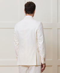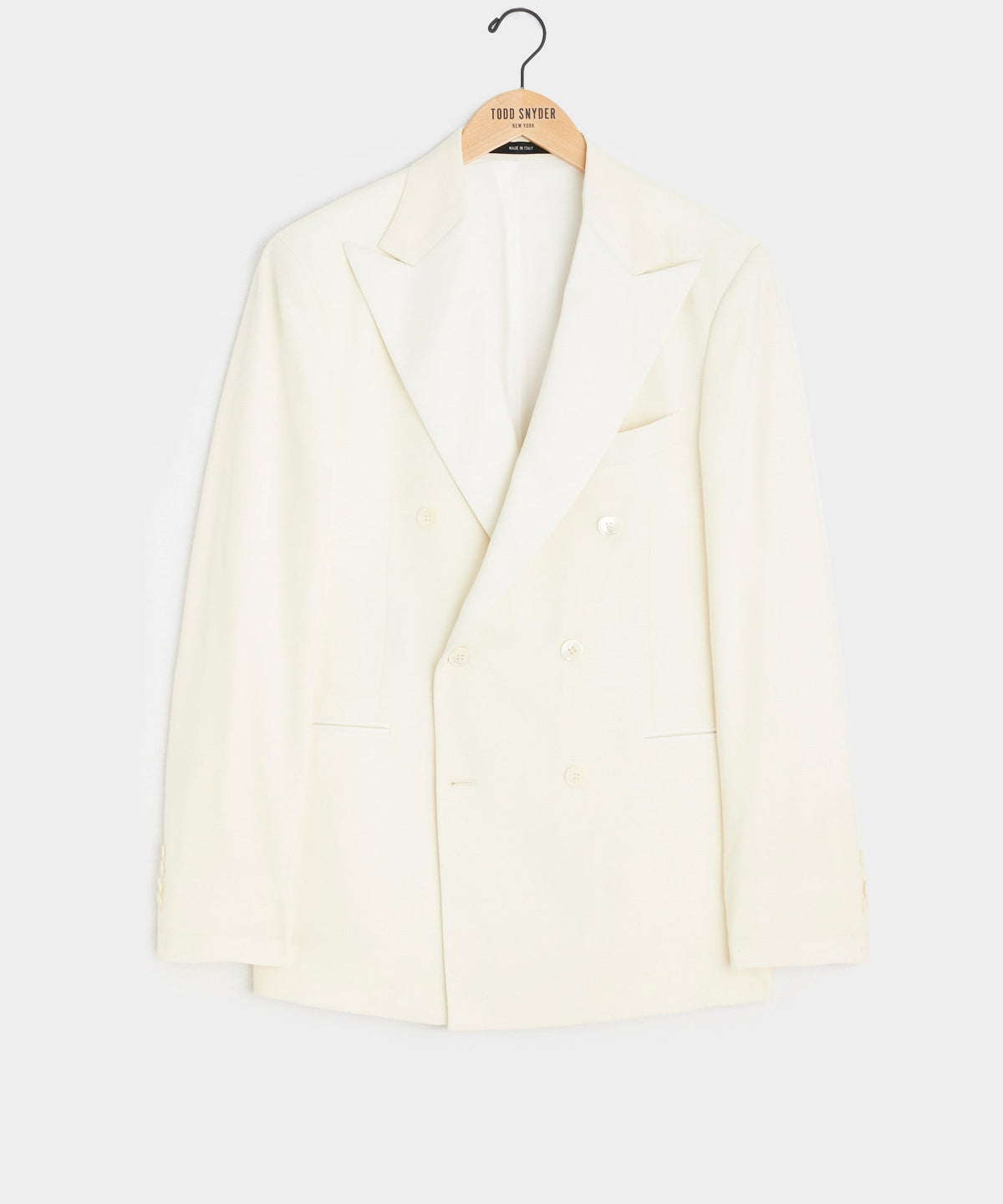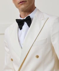 An essential for the sharp dresser, our luxurious Tuxedo Jacket is crafted in a handsome ivory wool from the renowned Italian mill, Tollegno 1900. This double-breasted take is a chic update on everything you love about the classic: modern, impeccable tailoring with a slim, tapered fit and a natural shoulder. Premium details include a wide satin peak lapel and genuine horn buttons. Whether you go black tie and pair this with black tuxedo Pants or treat it as a stand-alone piece for other looks, it’s a timeless, versatile choice for any special occasion — especially if you add one of our dress shirts and a bow tie to the mix.