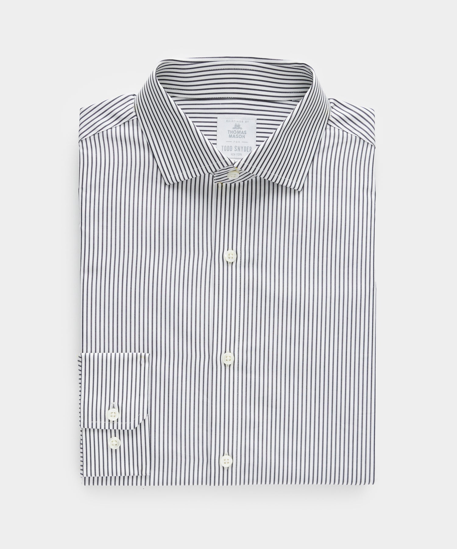 This luxurious dress shirt offers a refined update on a closet essential. Expertly constructed for the perfect fit, it’s crafted from cotton poplin in a classic black pencil stripe, which comes to us from Italy, by way of the fabric experts at Thomas Mason. Point collars, by the way, are a bit more traditional than spread collars — and they’re actually the same length, but the points themselves are further apart in a spread collar. This shirt is bound to become your new go-to for any occasion that calls for putting your best foot forward.