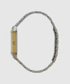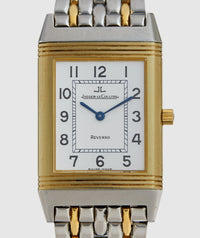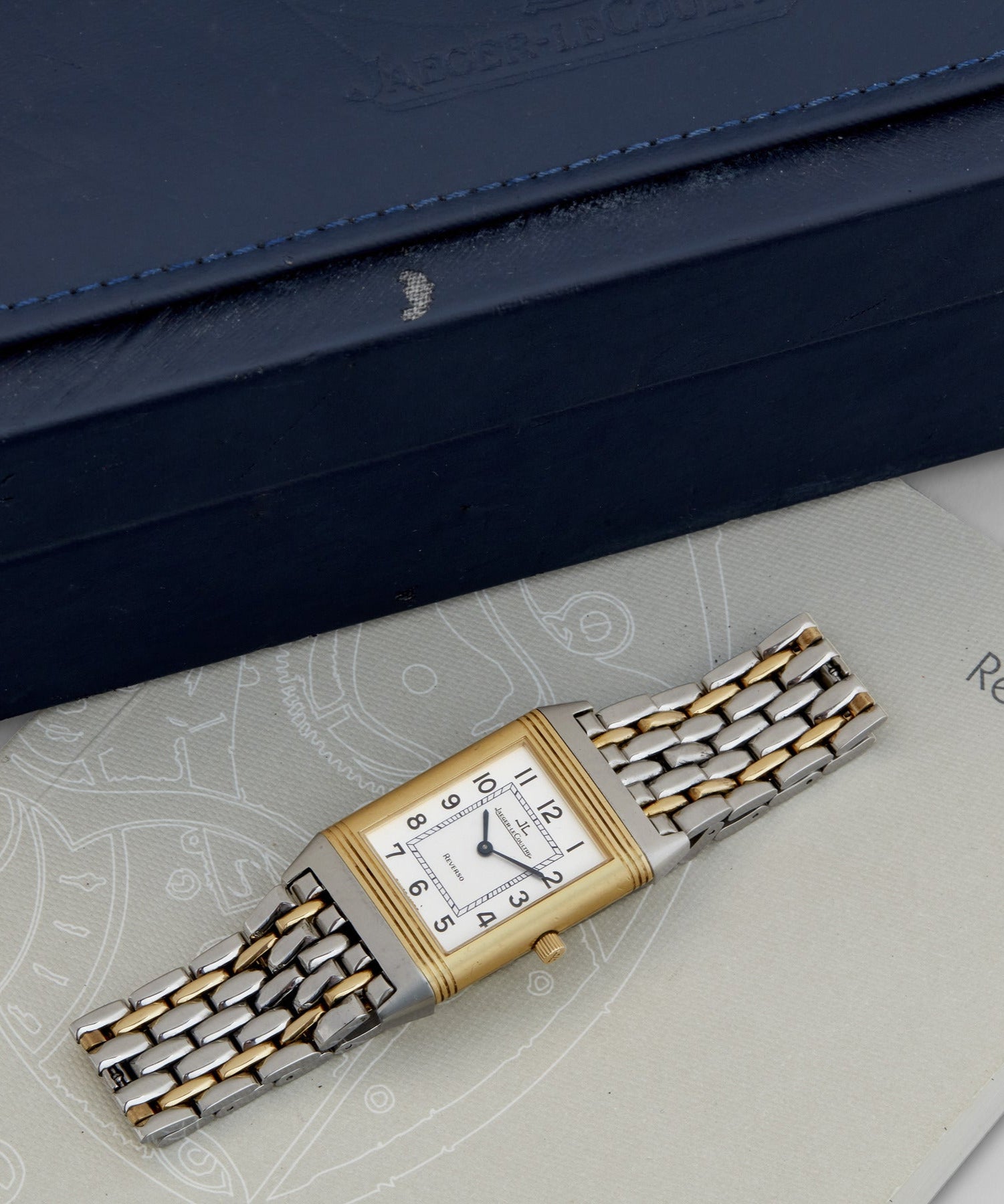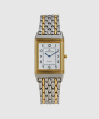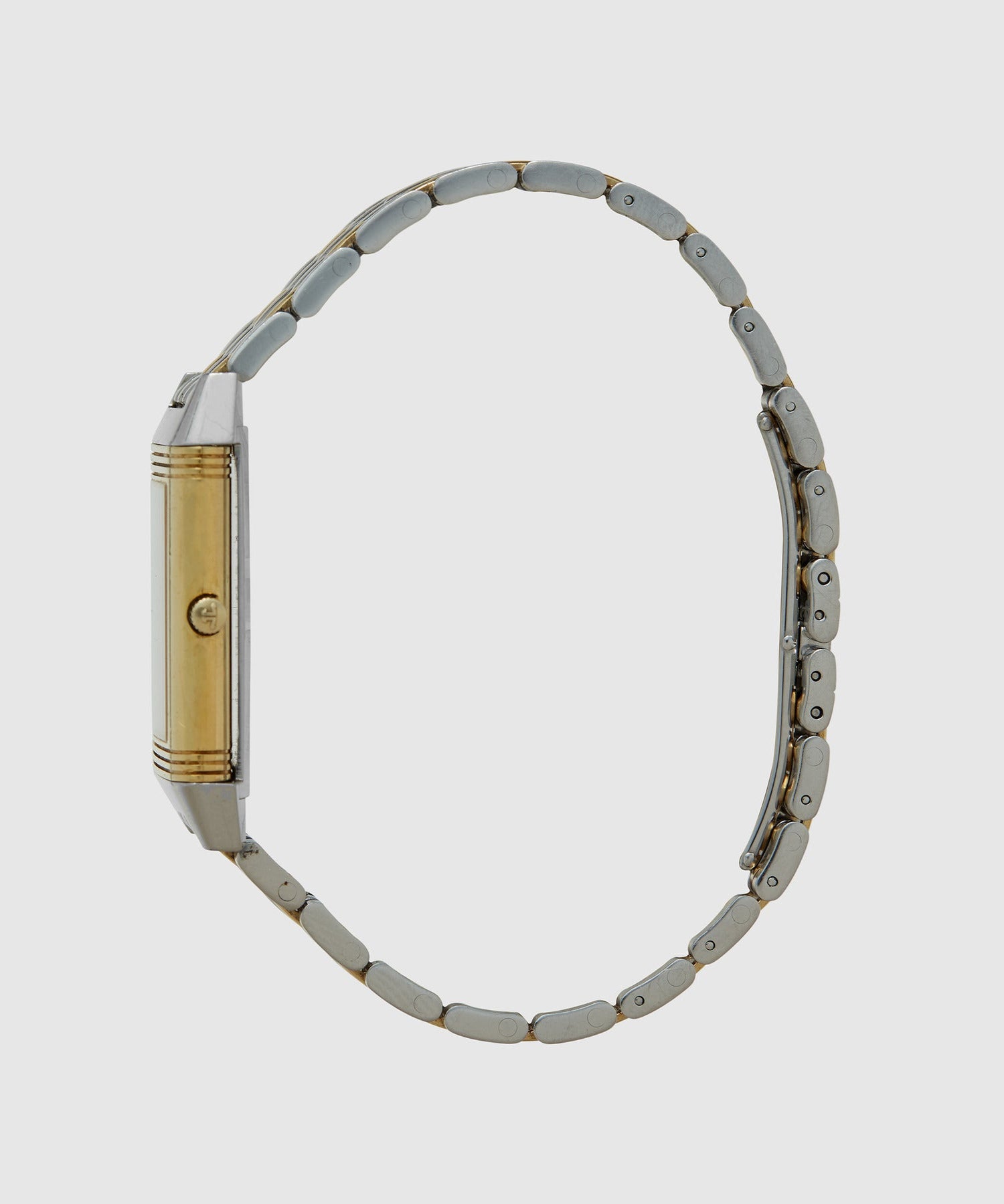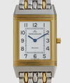 The two-tone case features a warm gold bezel framed by polished steel, paired with a silver dial accented by black Arabic numerals, blued hands, and a classic minute track. At just the right size, it wears slim and comfortably, true to the original spirit of the Reverso.