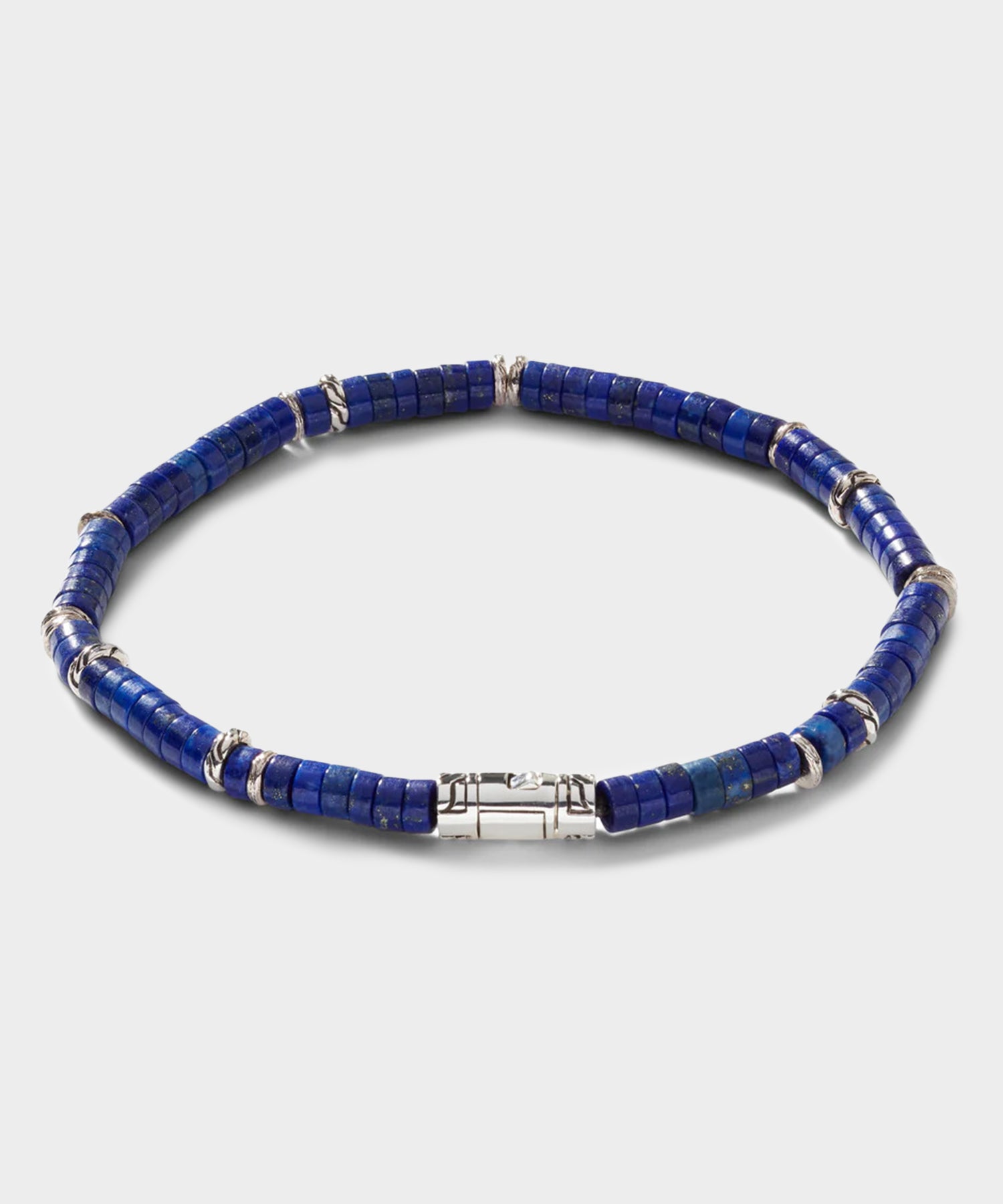 An artisanal hand-cut beaded bracelet in reclaimed sterling silver with ethically sourced lapis lazuli.