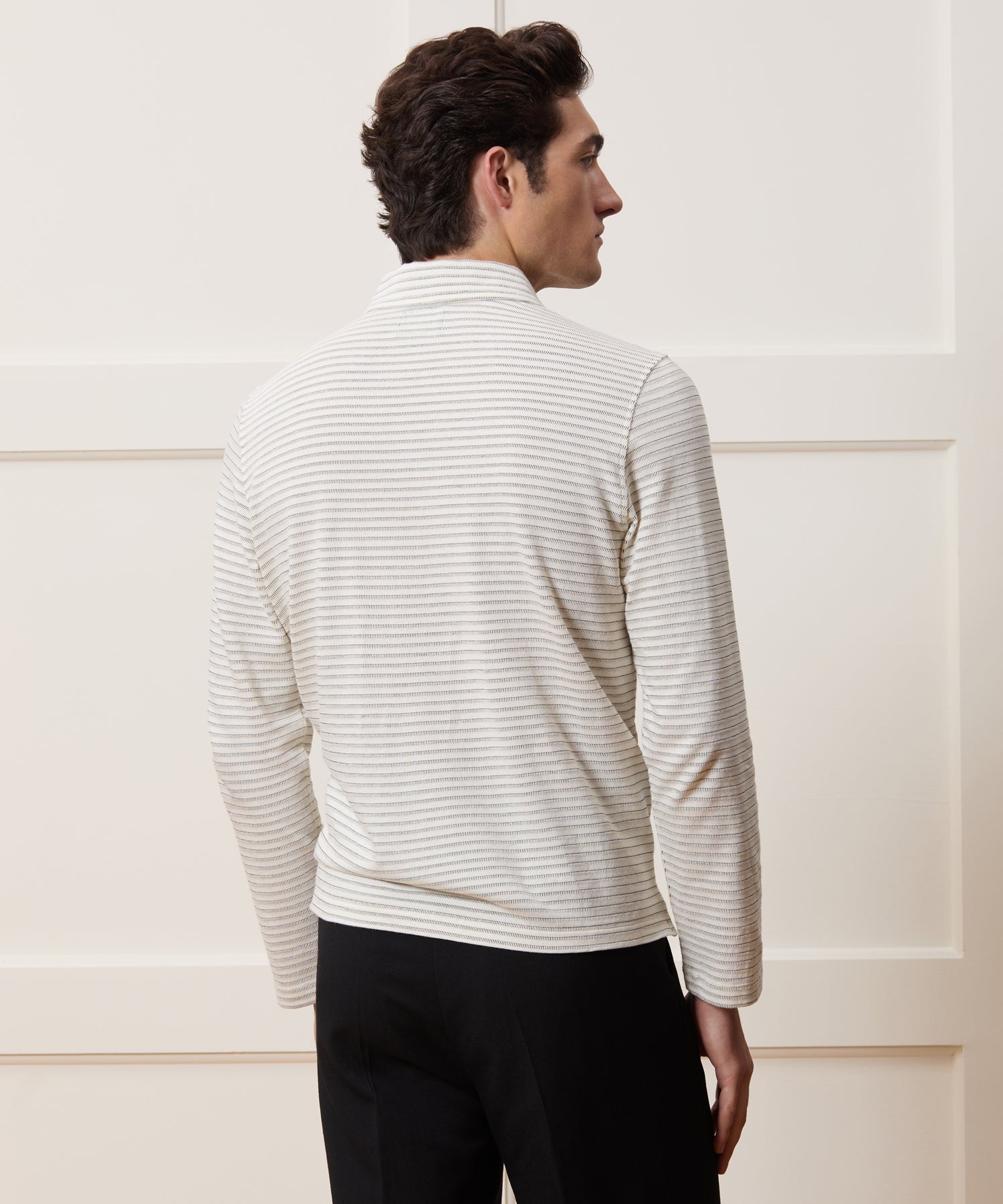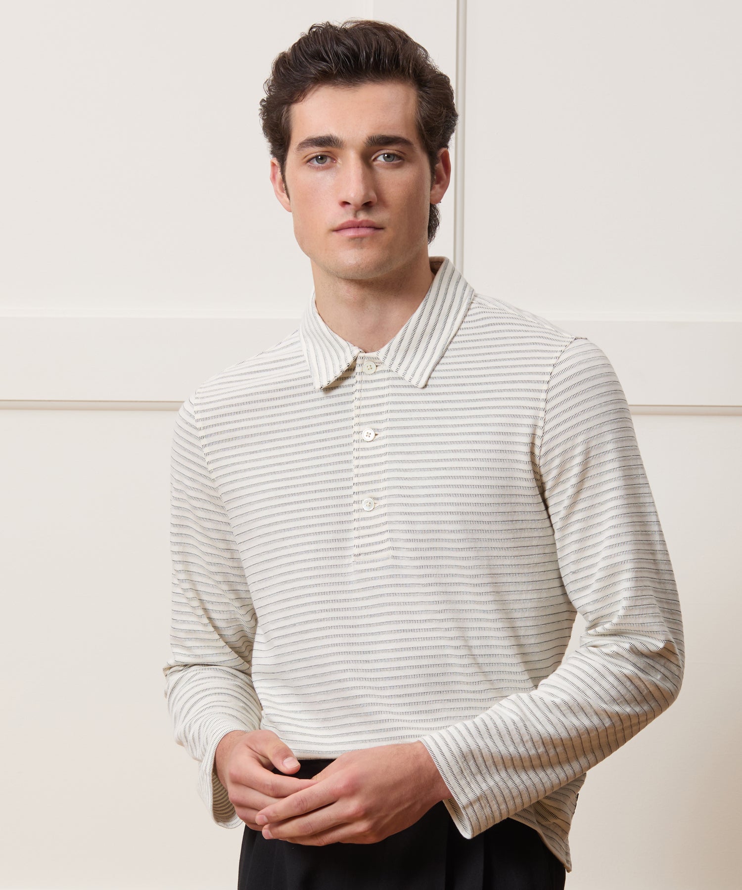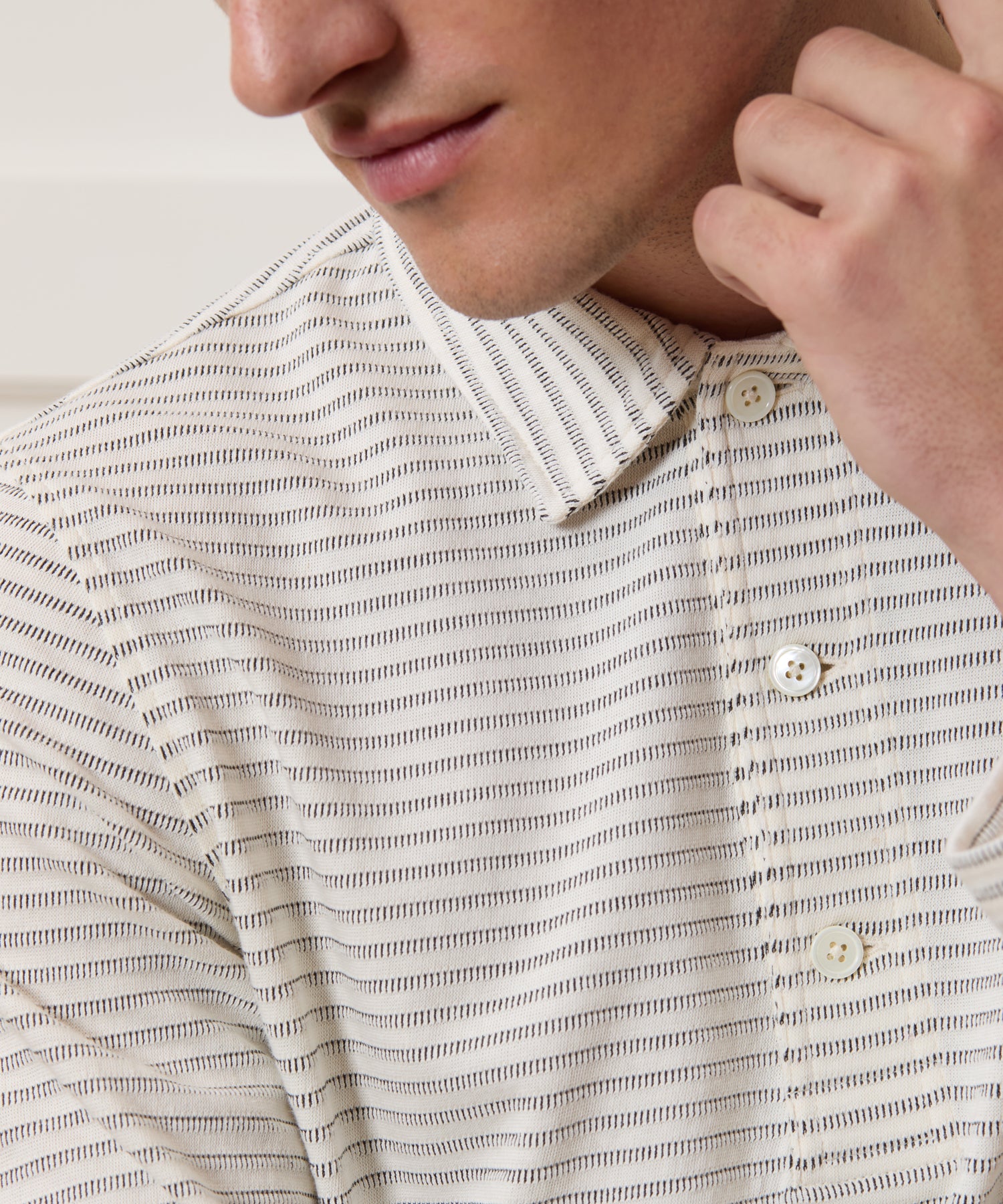 Crafted from a Portuguese fabric, this polo is soft, cool, and wildly comfortable. The cream-colored midweight fabric features a striking black jacquard stripe (which means it’s knit directly into the fabric). A deep placket and split hem give this gently relaxed shirt an easy, versatile fit — wear it casually, or try it with black trousers and a black sport coat for a more dressed up look.