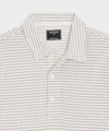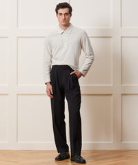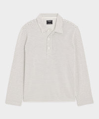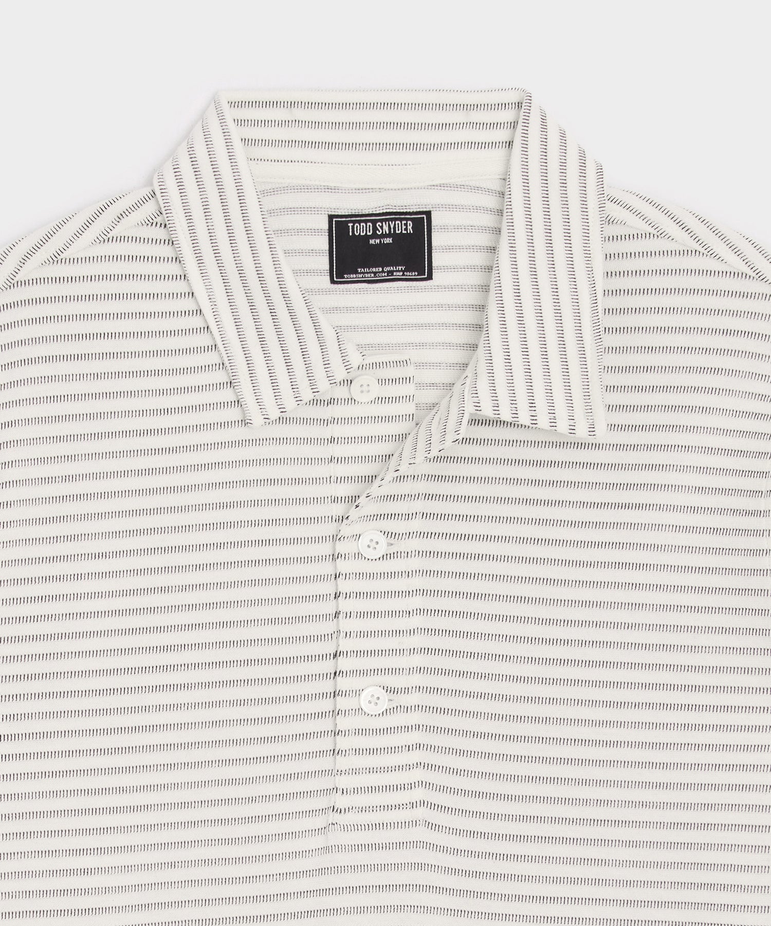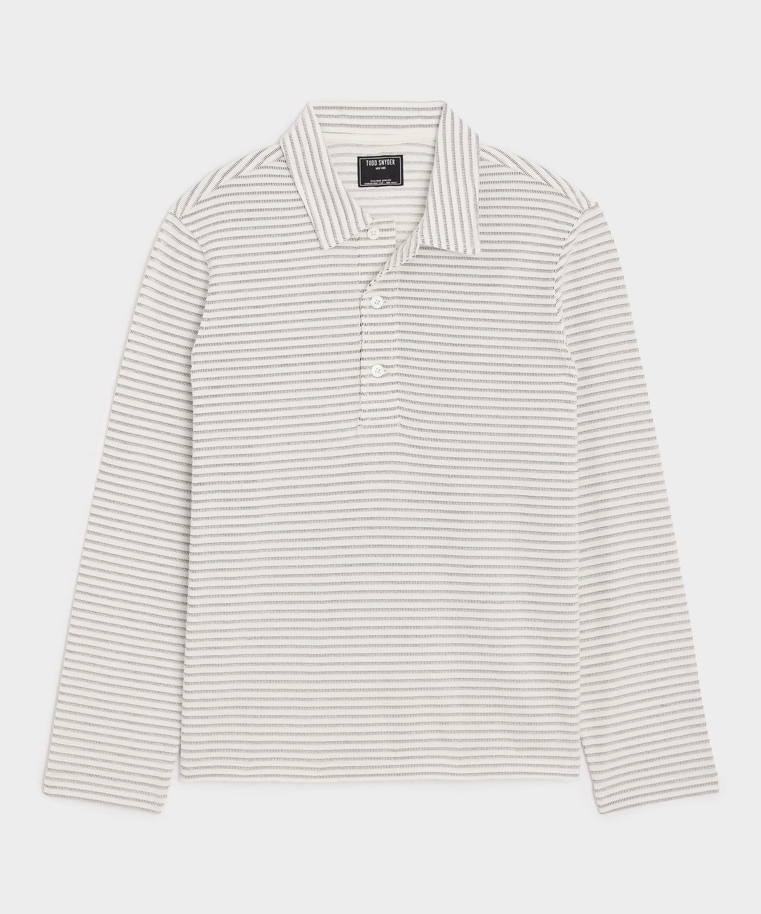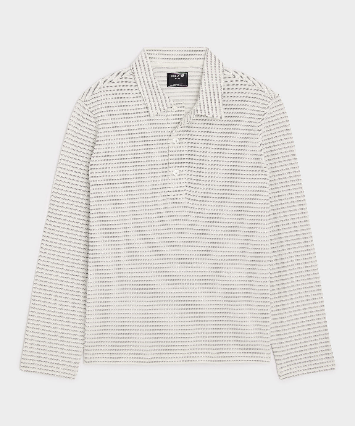 Crafted from a Portuguese fabric, this polo is soft, cool, and wildly comfortable. The cream-colored midweight fabric features a striking black jacquard stripe (which means it’s knit directly into the fabric). A deep placket and split hem give this gently relaxed shirt an easy, versatile fit — wear it casually, or try it with black trousers and a black sport coat for a more dressed up look.