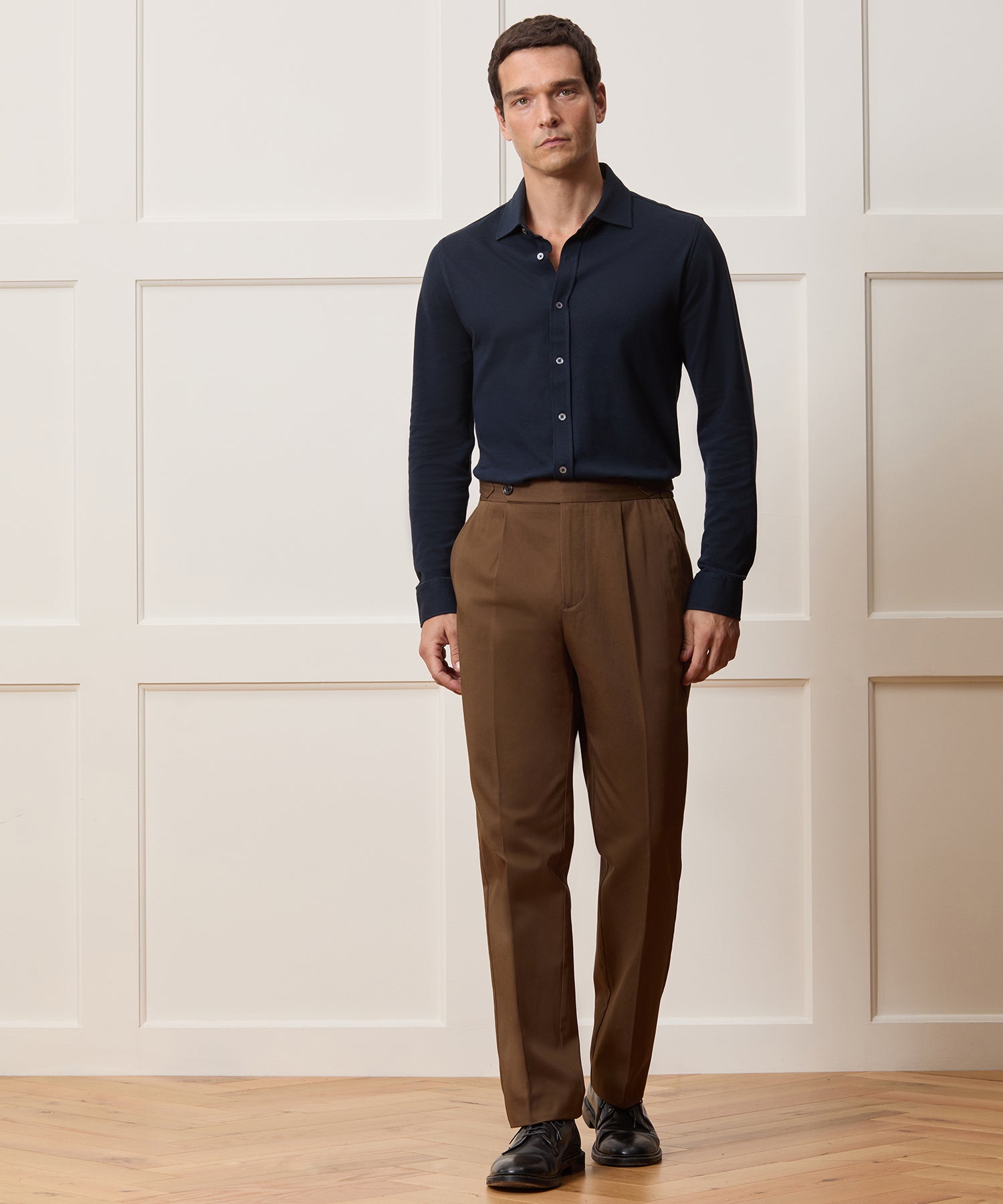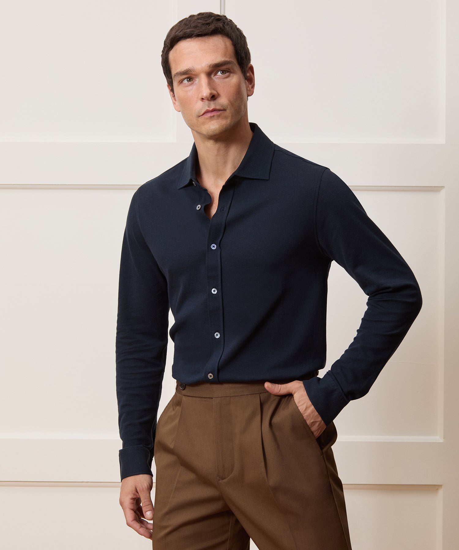 Never sacrifice on comfort or style. Our Pique Dress Shirt is a sneaky combination of both, with the looks of a classic woven shirt and the feel of your favorite tee. The fabric is a blend of cotton and a touch of cashmere; it’s a finely textured pique that’s breathable, soft, lightweight, and has just the right amount of stretch. The longer point collar and tailored means this looks excellent with a tie and slips easily under a sport coat, but it’s just as sharp on its own, too.