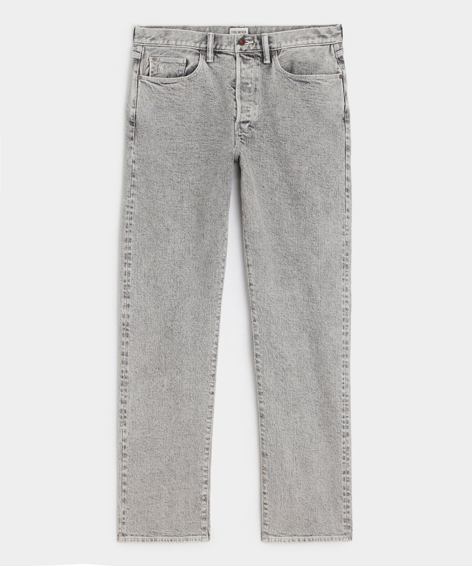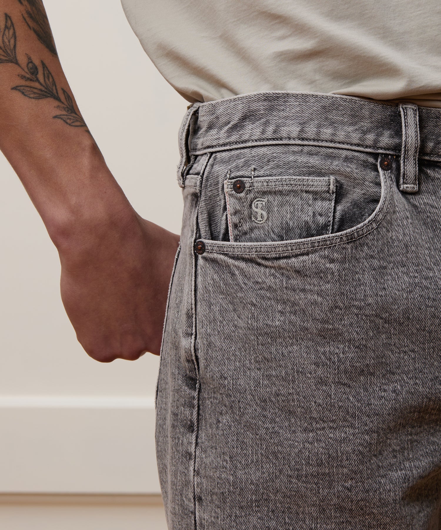 Our Selvedge jeans are loaded with quality, vintage-inspired details, including a shank button fly and oxidized rivets. There are also genuine selvedge outseams; when you turn up your cuff, you’ll spot that giveaway red ticking at the edge. Our Straight fit is the Goldilocks between Slim and Relaxed: mid-rise, straight through the leg, totally classic. All told it’s about an inch bigger through the thigh, knee and rise than Slim. Gray Acid Wash is a bleached-out black-and-white twill — think refined take on the 80s classic, set off by white stitching.