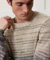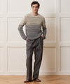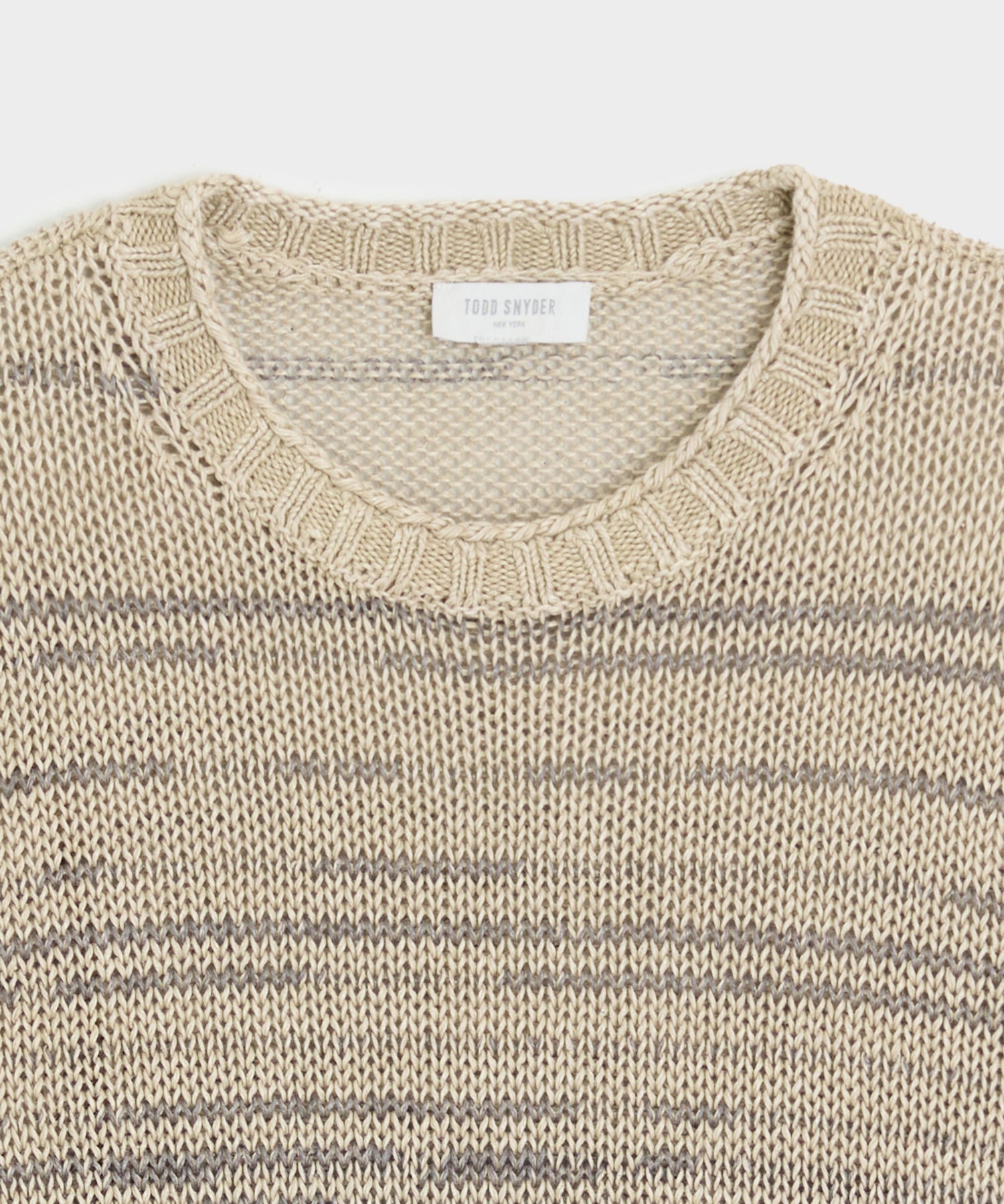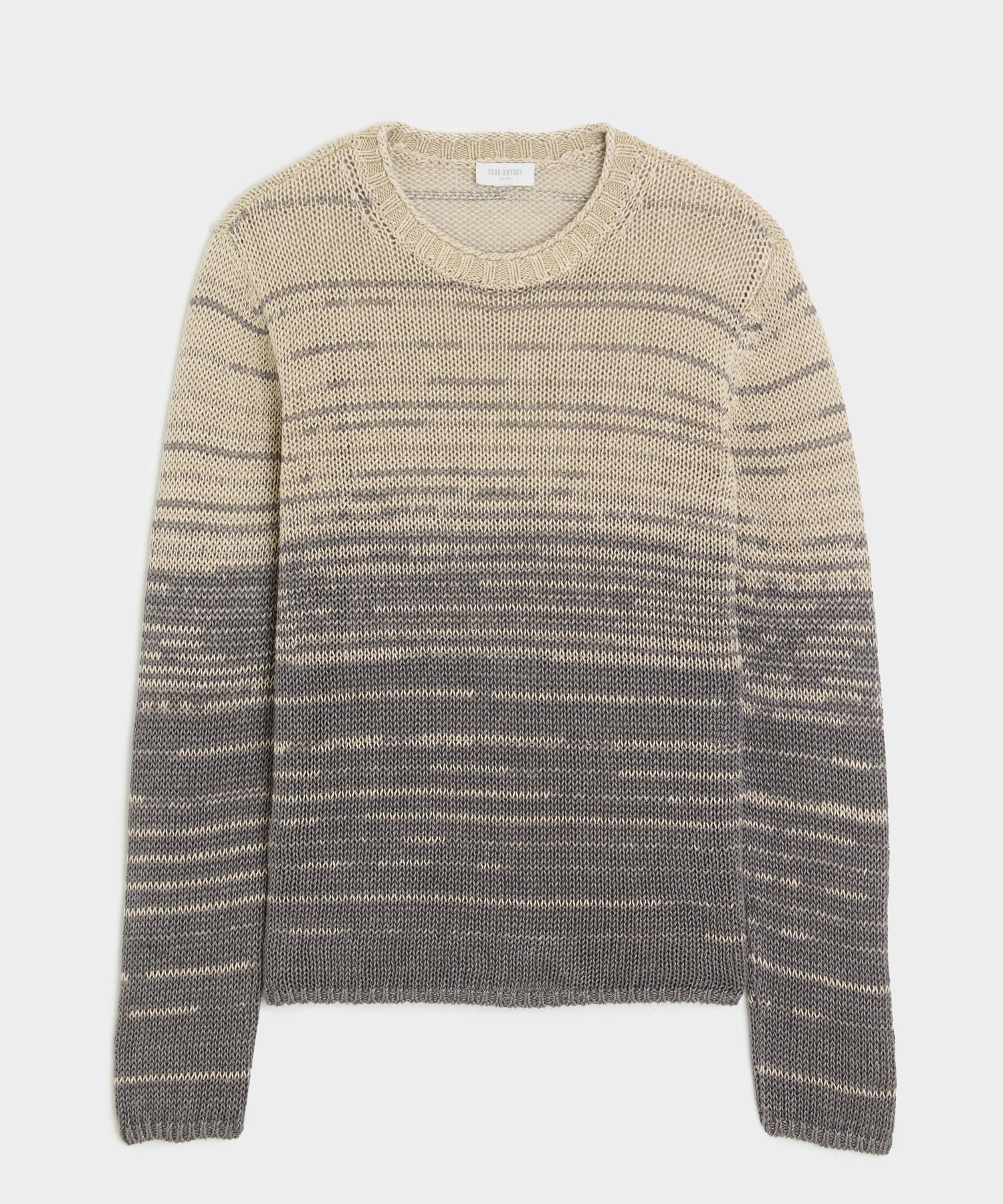 This elevated crewneck sweater is made entirely from linen, and has the classic dry handfeel and subtle, lustrous look. The ombre effect is created by parallel knitting two solids in at the same time, which results in the long striations between smoky gray and pale beige — it also means every sweater is unique, and will be slightly different. The detailing at the neck (a wide rib that transitions into a crocheted rolled edge) is one of our favorite details. Heads up: This sweater has a relaxed silhouette, but the nature of the linen yarn means it will grow a little over time for an even easier fit.
