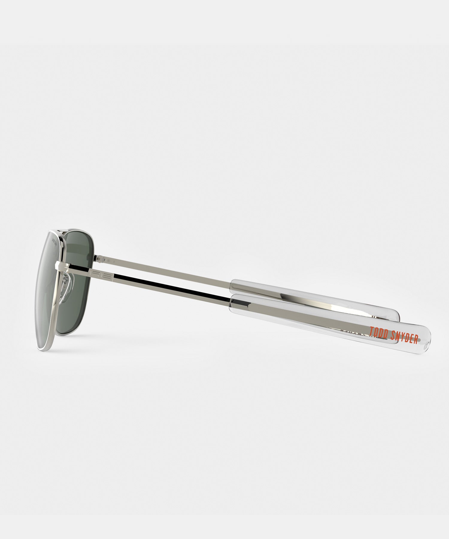 In the Seventies, formerRoyal Air Force navigator Jan Waszkiewicz and machinist Stanley Zaleski both immigrated to America with a few dollars in their pockets and a dream: to build the world’s best sunglasses. A few years later they joined forces with the U.S. military to produce the HGU-4/P Aviator for fighter pilots. These Randolph aviators weren’t just durable and innovative. They were stylish. Don Draper wore them inMad Men. Junya Watanabe styled with them in his Spring 2022 show. And now Todd, a longtime fan, has worked with this family-owned business to create four exclusive styles made from jewelry quality metals.