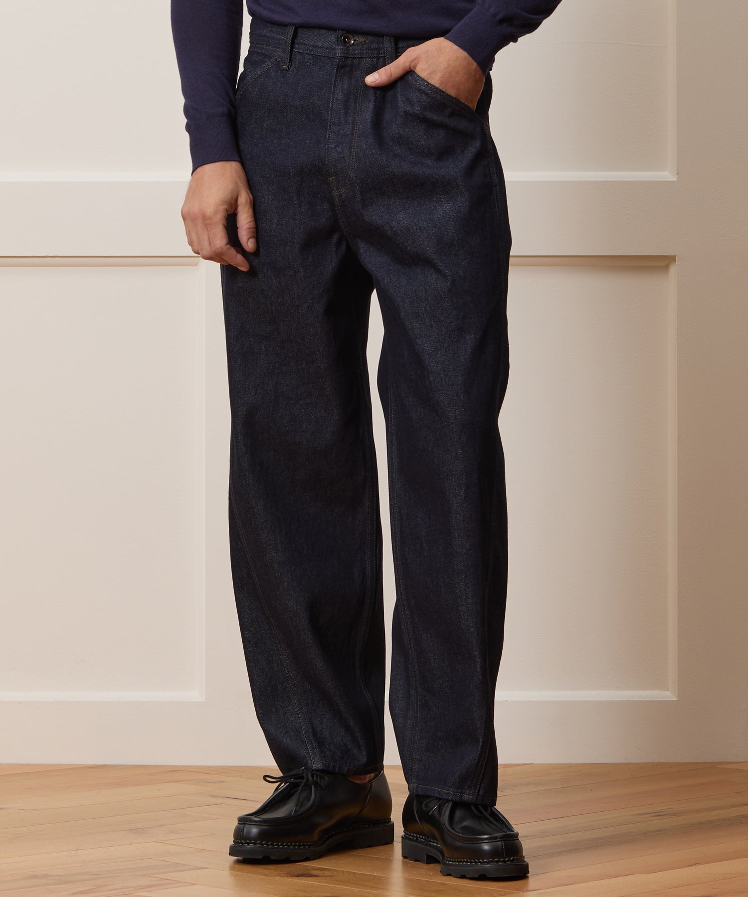 These Barrel Jeans are crafted from a true 13.5 oz indigo denim; it’s given a unique resin wash that turns it a slightly darker shade, for the look of raw denim without the stiffness. The fit complements the chic fabric: slightly relaxed, roomier up top before tapering at the ankle, with a twisted seam to help create that iconic barrel shape. That taper keeps these looking sleek and clean; no puddling here. Try wearing these with shorter, boxier shirts and jackets let the proportions shine.