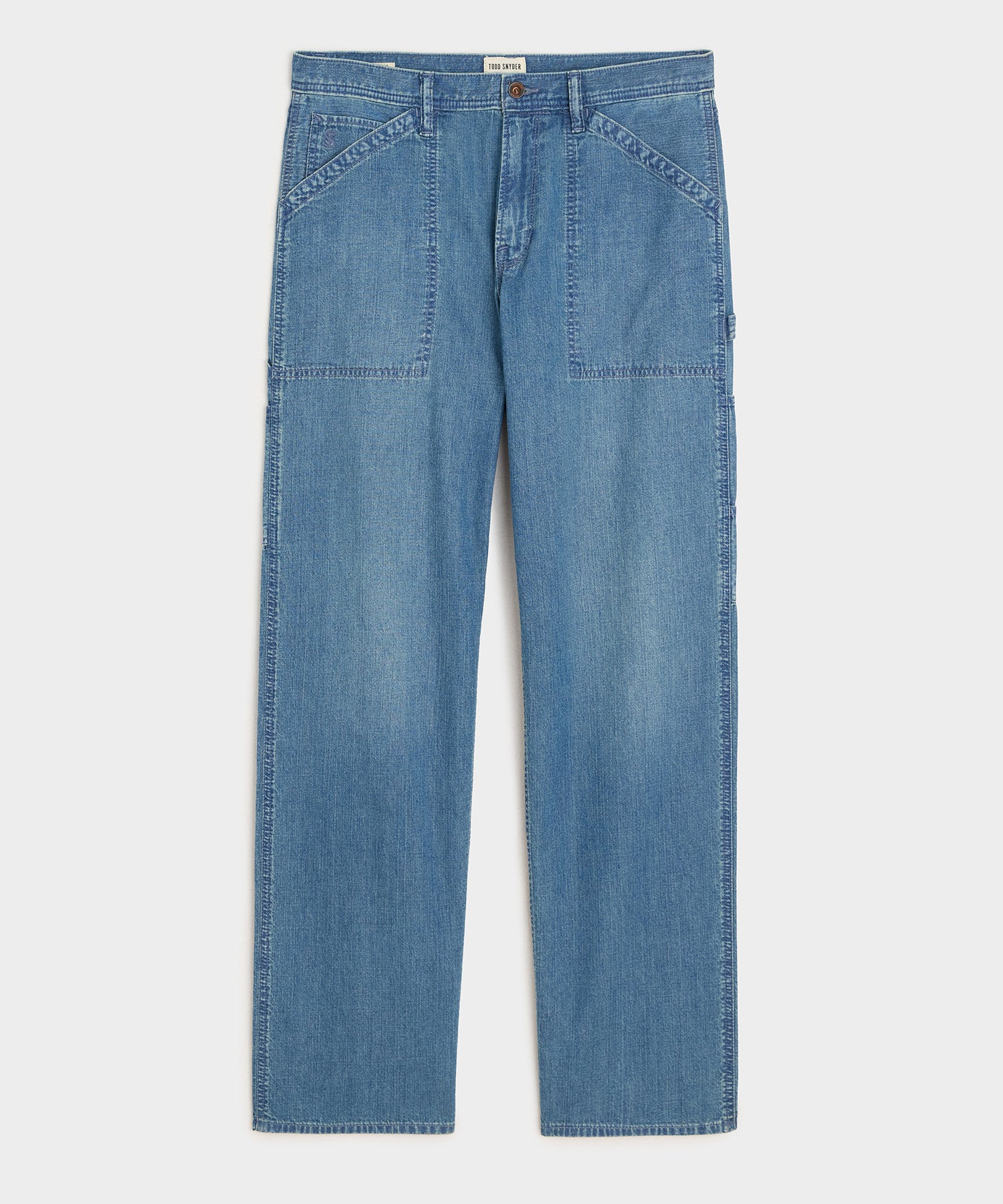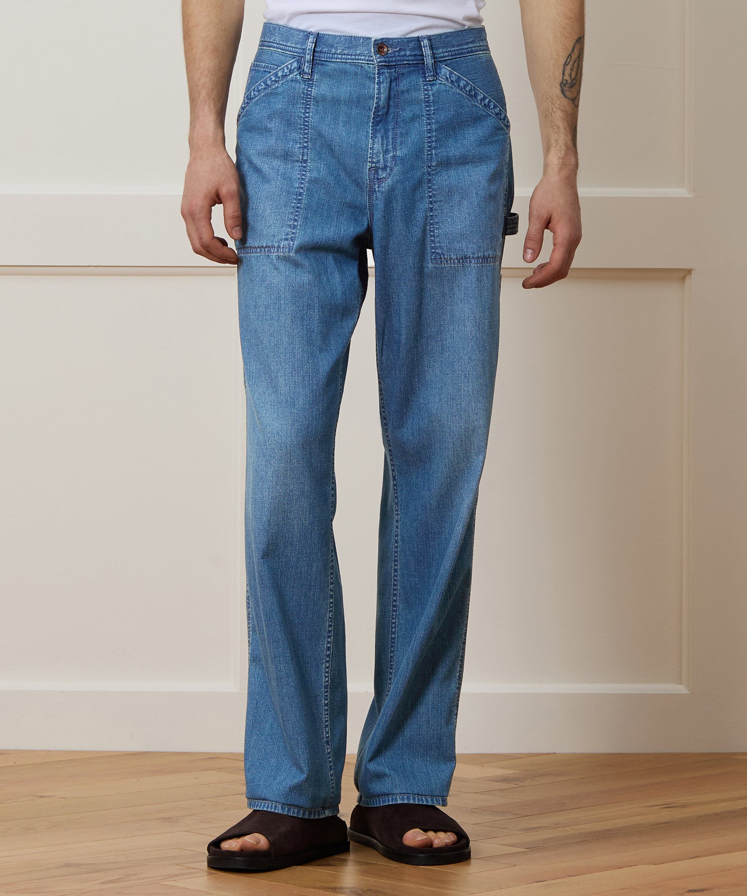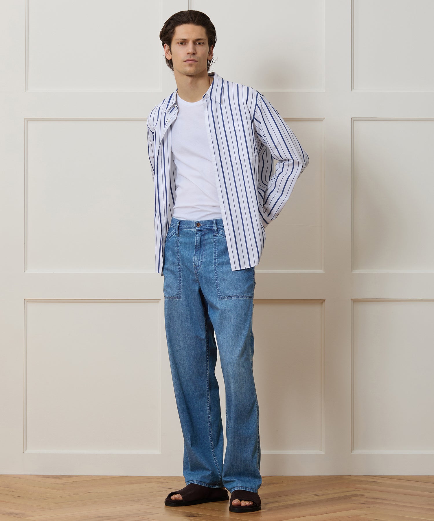A new arrival to our workwear lineup, just in time for hot summer days. The Relaxed Painter Jean is inspired by a vintage find, and the design keeps many of the same utility details, including a hammer loop, tool pocket and reinforced back pockets. It’s made from our lightest denim yet: a featherweight 7.5oz cotton from Japan. The fabric is sanded at the knees and pockets and washed down for a worn-in, vintage-inspired look that complements its lightness and softness. The full, stovepipe leg looks best styled with a big, turned-up cuff — just throw on your favorite tee or a cropped shirt to complete the look.