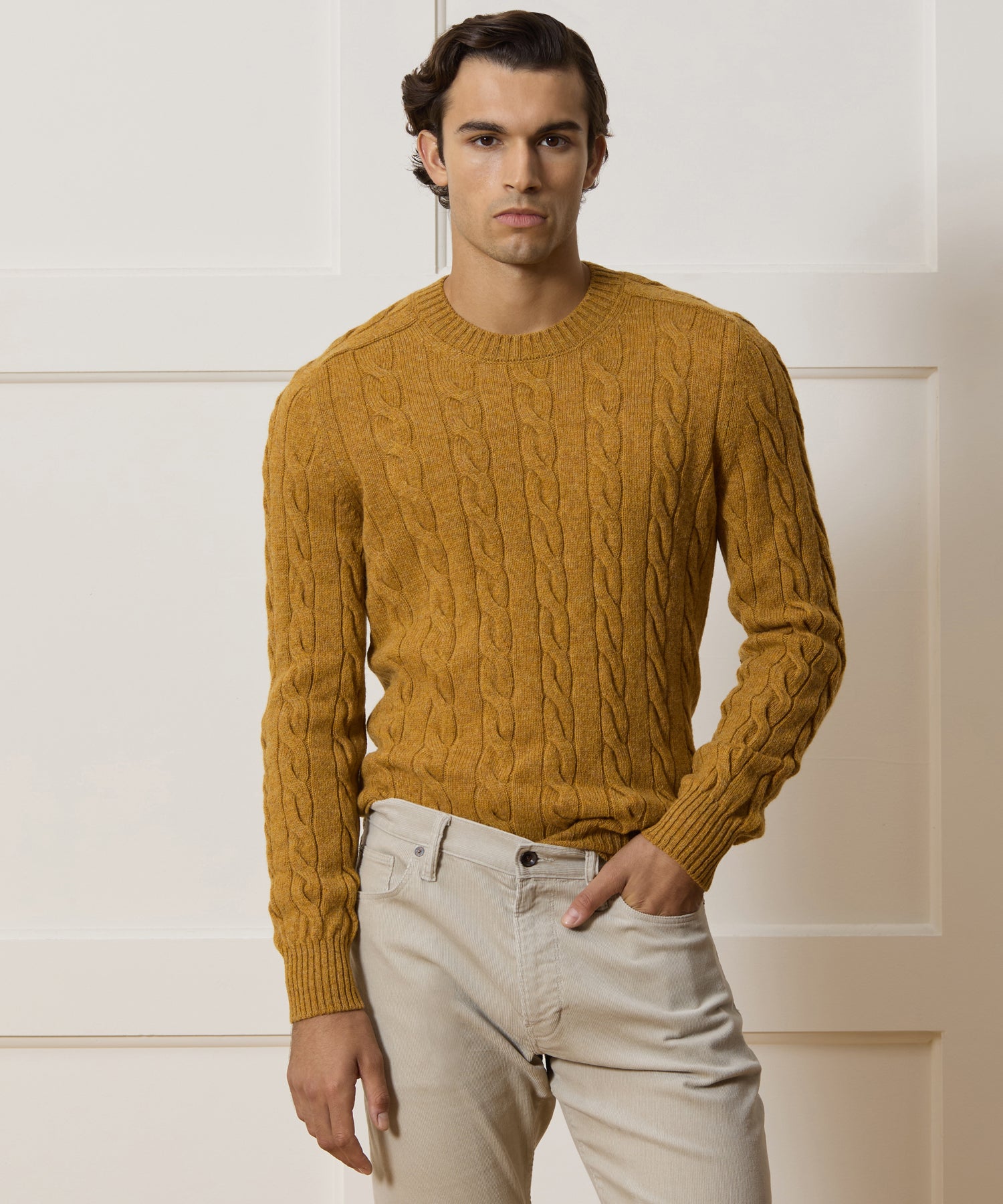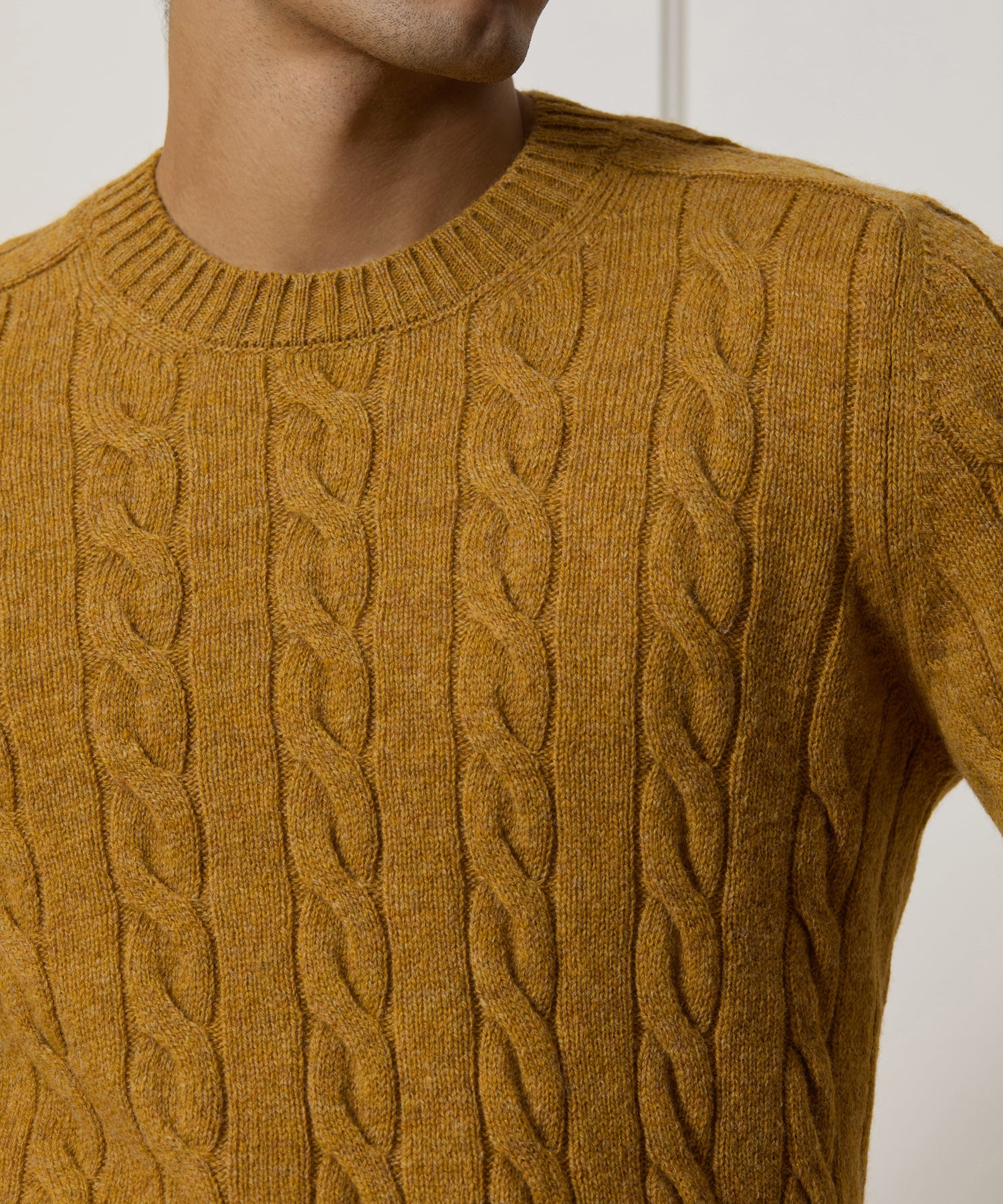 Following close behind tweed, cord and flannel in the fall lineup: the cable knit lambswool sweater. This take on the classic Shetland Sweater is made from 100% Italian chanteclaire wool with a gently fuzzy texture — ”chanteclaire” refers to the unique, slightly heathered color of the yarn here. Want to channel the Ivy aesthetic? Just pop it on over an Oxford shirt.