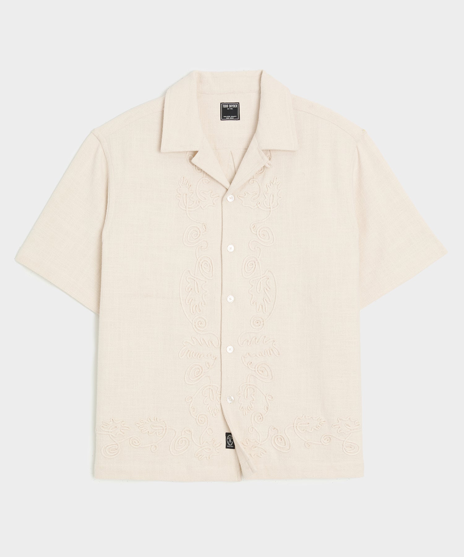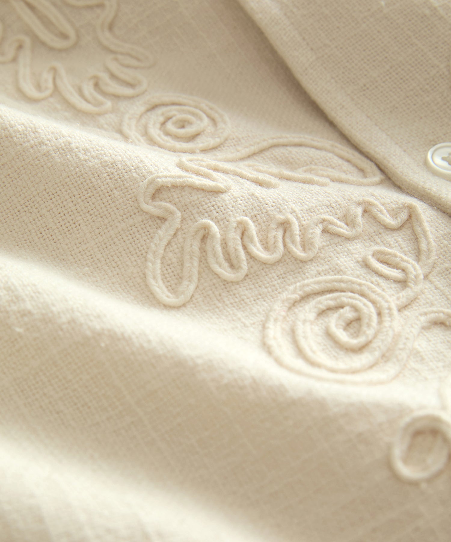 Effortlessly cool. This shirt is crafted from a handsome slub cotton — artisanal, soft and gustier in nature. It features an abstract botanical detail along the placket and hem, worked out in top-applied cording for a tonal, textural touch of pattern. With a boxy, easy fit, it’s the perfect vacation shirt for days when you want something easy to pop on that still makes an impact. The boxy fit looks great when it's worn all on its own, but it looks excellent open over a tee or tank, too.