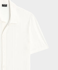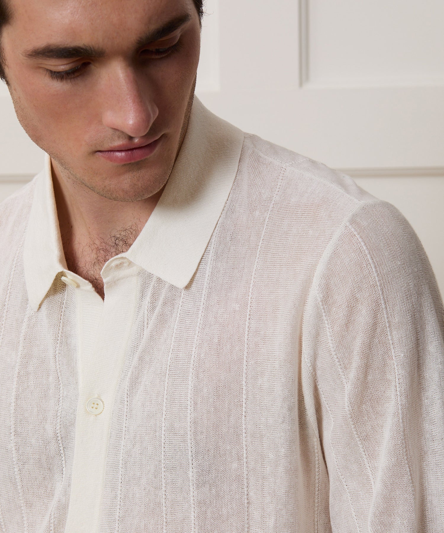 This summery sweater polo is knit from pure Italian linen with a super dry, fine, and lustrous handfeel. It’s so airy and light, in fact, that it’s slightly sheer — which makes it the perfect pick to wear over a tee or tank, or unbuttoned as a light layer. It features a vertical stripe for subtle texture, and is knit side to side, which helps it to hold its shape with wear. The slightly cropped fit looks extra chic untucked.