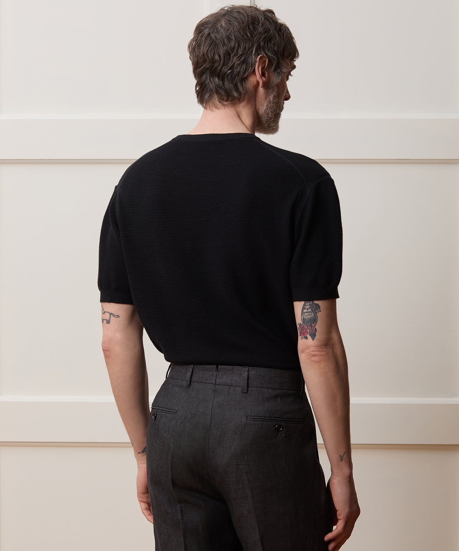 The perfect crewneck for the warmer months of the year. Our Vista sweaters are knit from a luxe Italian yarn that combines organic cotton and mulberry silk, creating a lightweight fabric with a soft, buttery handfeel. They’re woven in a seed stitch that creates a unique texture, like a tight pique or mini-waffle. Clean styling, short sleeves and a classic fit make this crew the perfect choice for wearing all on its own with a pair of trousers or layering under a suit jacket or sport coat.