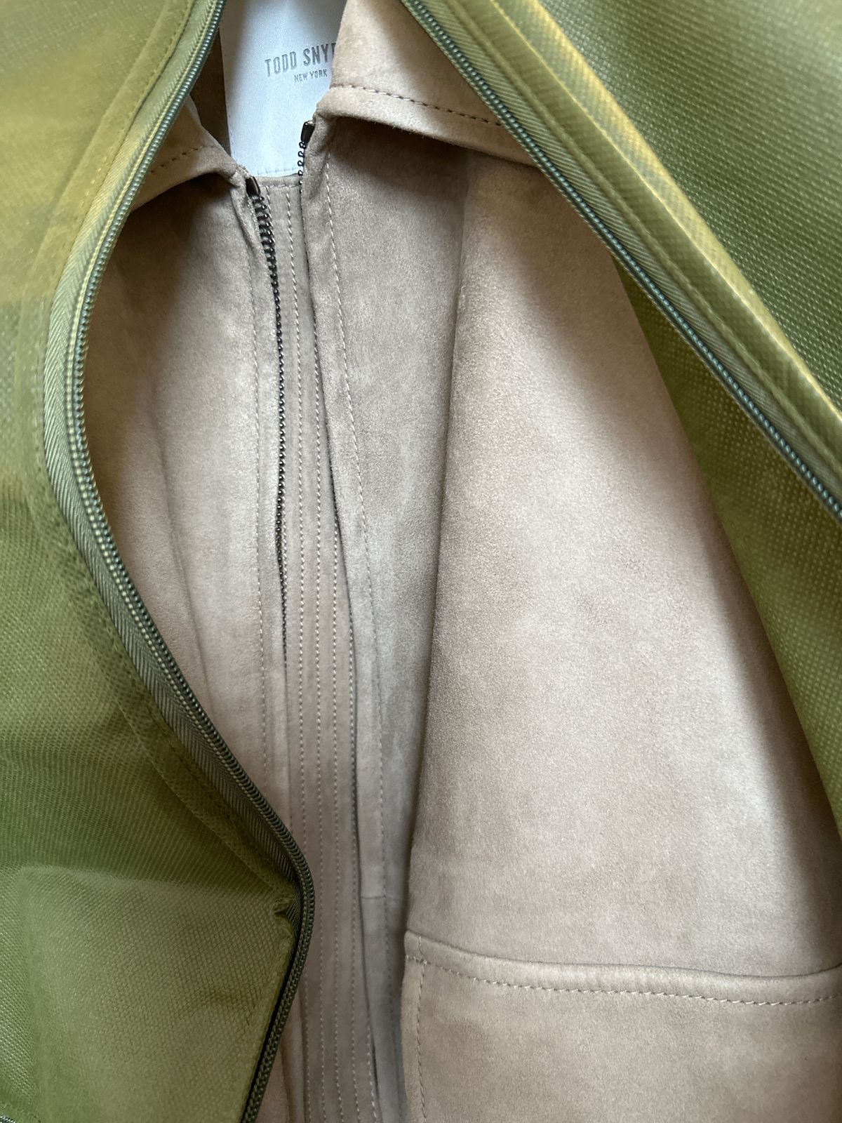 A little darker color in person. Really nice suede, I wear a medium and sometimes a large t shirt, and the large fit perfectly.