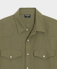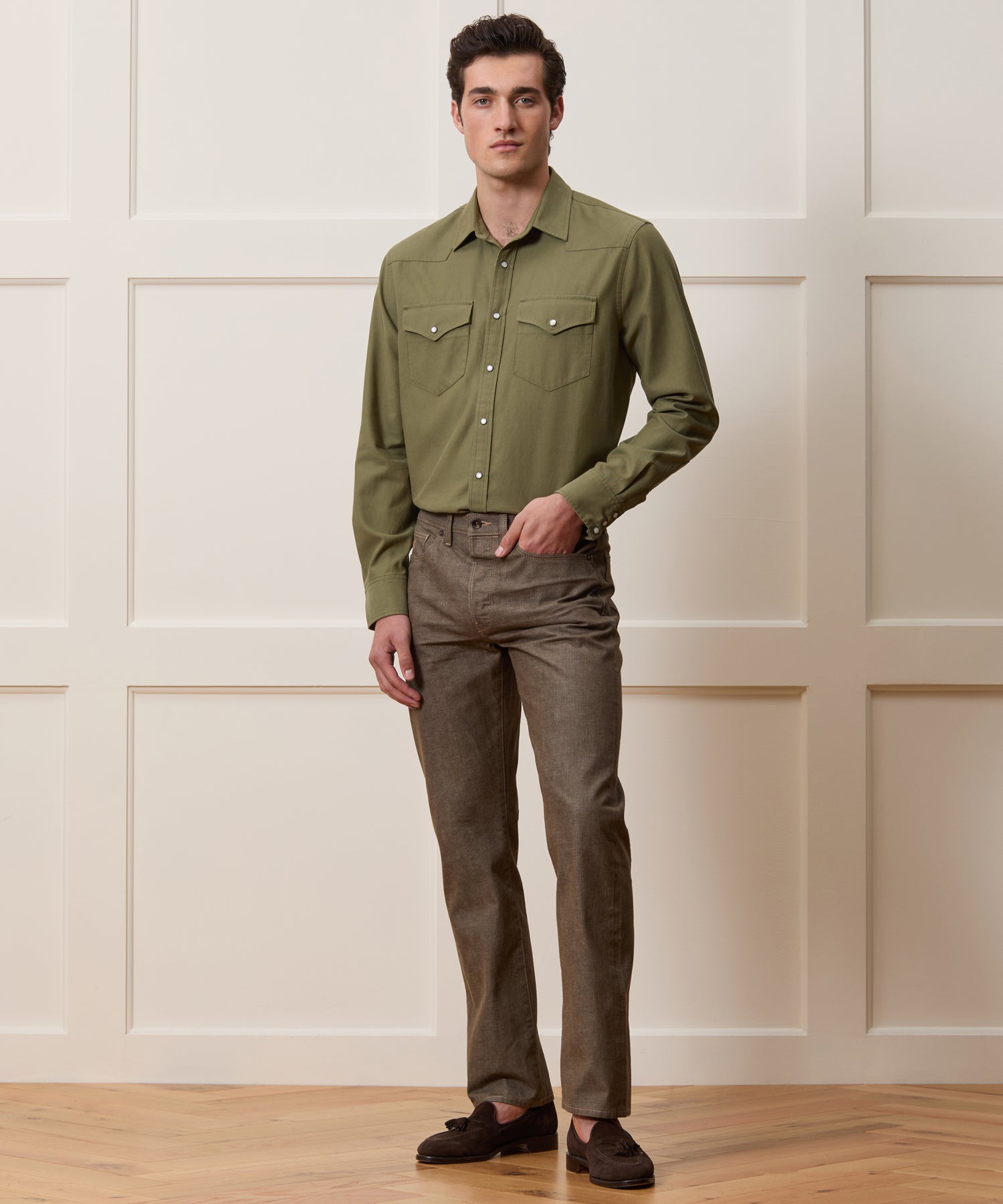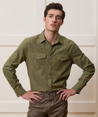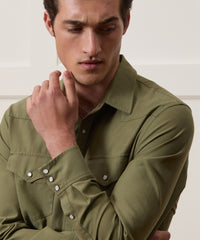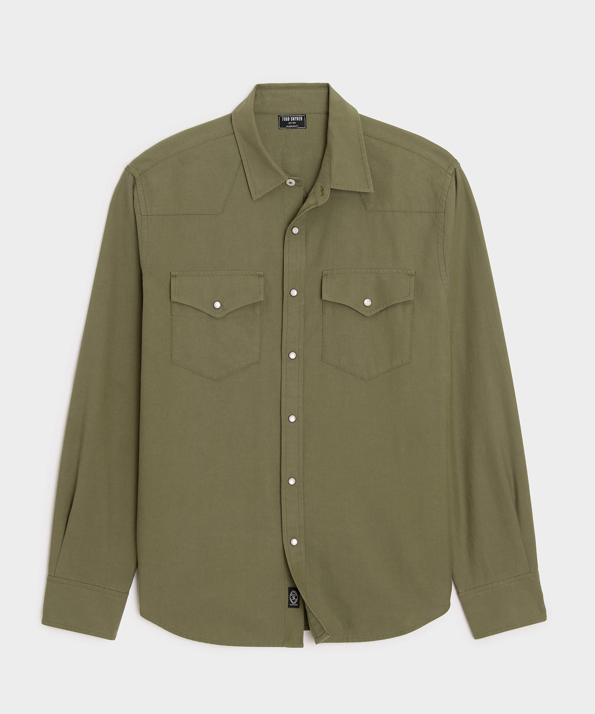 The charm of a vintage Western shirt in an elevated cotton and TENCEL™ blend. Traditional details include a yoke at both the chest and back, and snaps at the placket and cuffs in faux mother-of-pearl. Fun fact: Western shirts used snaps instead of buttons so that you could easily hold your reins in one hand while rolling up your sleeves with the other.