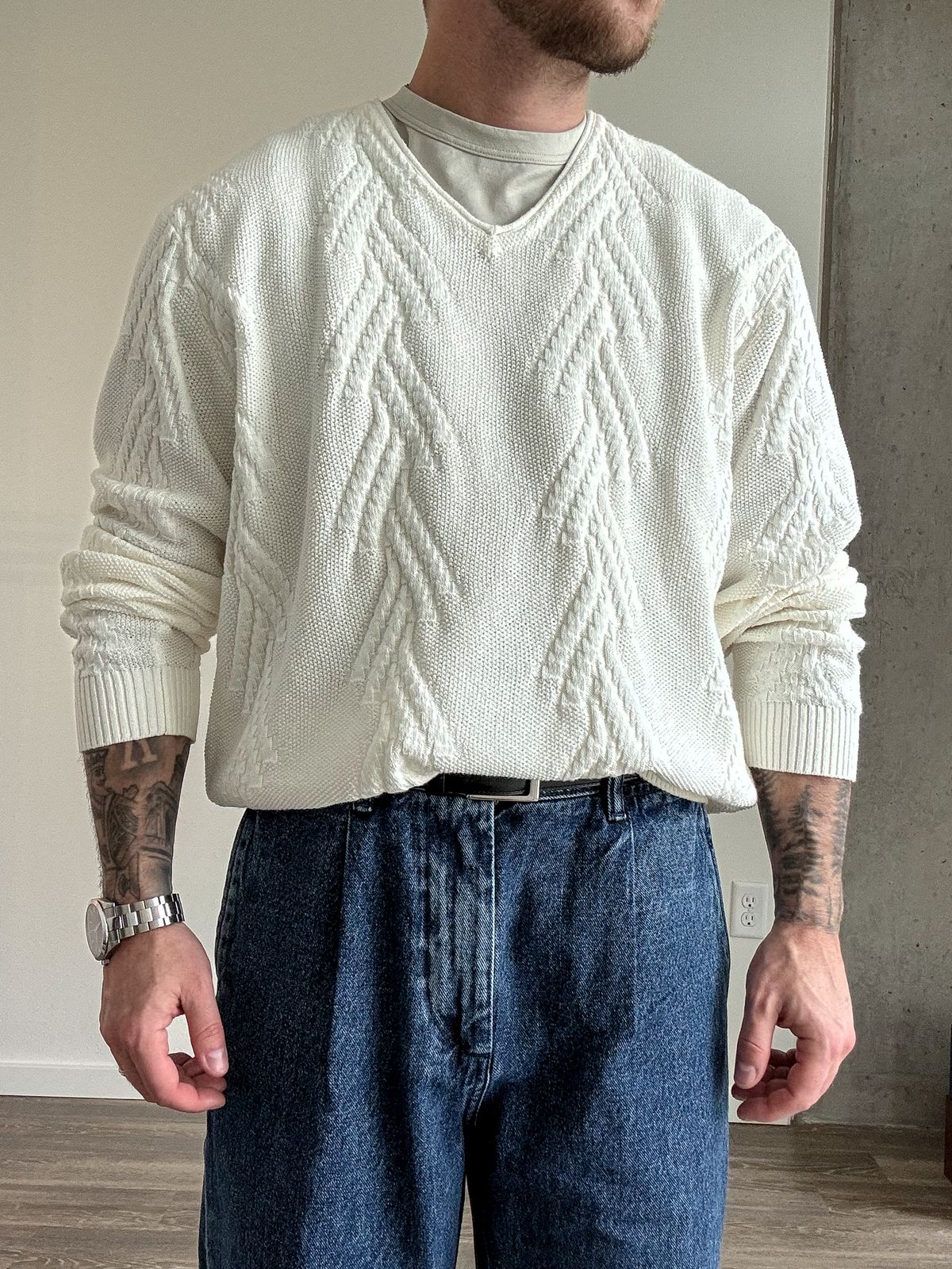 This easy sweater is made from cotton yarn — in other words, it’s warm, but still breathable, making it the perfect piece to help you navigate the shift between seasons. It’s knit with a variation on a classic cable stitch to create branching channels, layered over a seed stitch for subtle texture throughout. With a shallow v-neck collar and gently oversized fit, this is just as easy to wear solo as it is layered over an Oxford shirt.