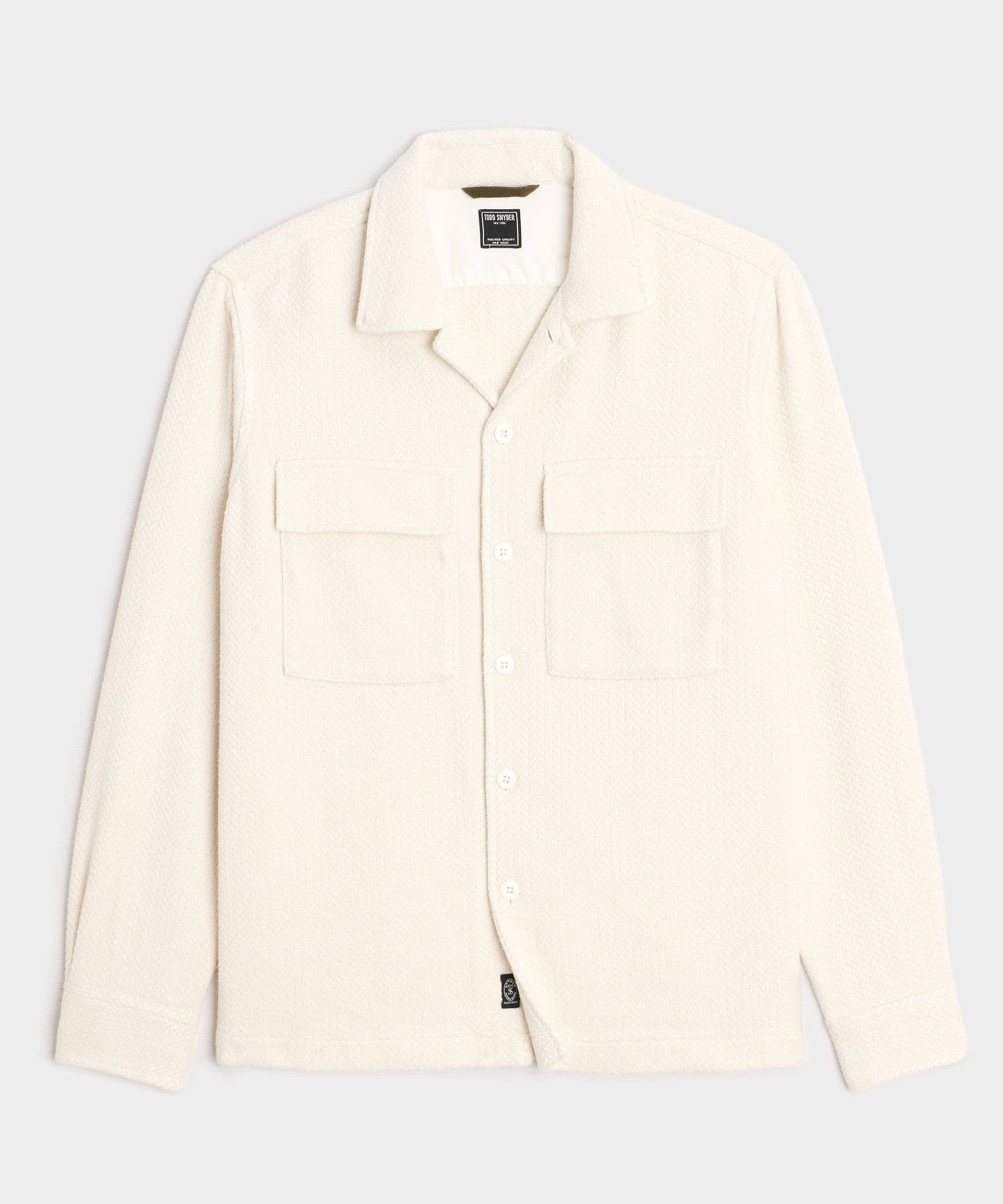 A riff on a favorite style of Todd’s (the utilitarian CPO shirt), this Shirt Jacket is crafted from a luxe yet rugged Italian fabric that blends linen and cotton in a tonal herringbone. Two patch-and-flap chest pockets at the chest are a clean, modern reference to the original inspiration, and the melamine buttons are a nod to vintage military uniforms. Pop it on over a turtleneck in late winter, and wear it on its own or as a light layer in early spring.