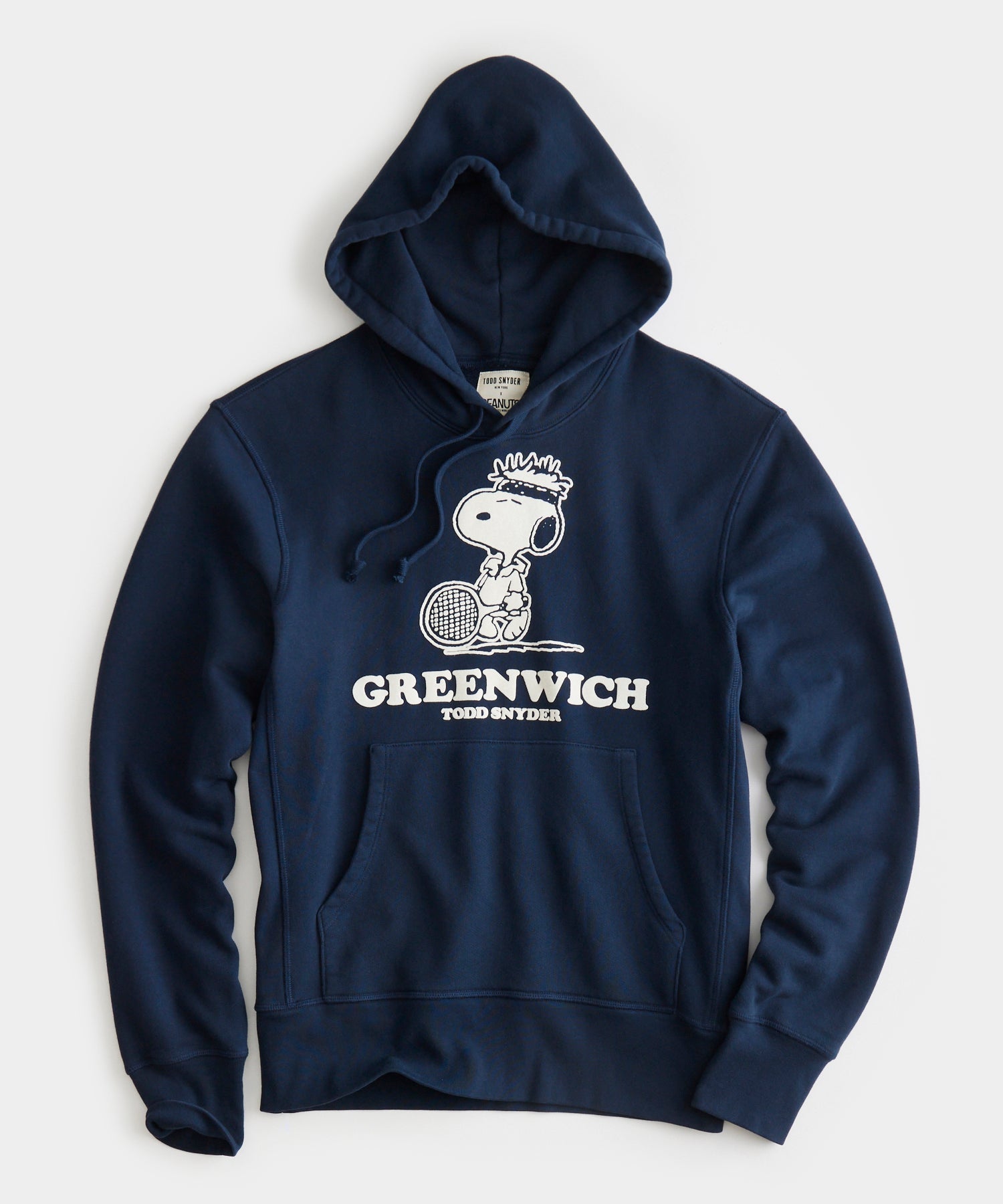 This limited-edition hoodie is part of an exclusive capsule with the Peanuts® Gang. Inspired by a vintage 70s style from Todd’s personal Champion archives, each one features a soft, chenille-like graphic highlighting a few of our favorite cities. This one for Greenwich captures Snoopy in his tennis whites, heading to a match at the local Country Club. It’s made in Los Angeles, from one of our absolute favorite sweatshirt fabrics, a soft, plush, high-quality cotton terry. Pick your favorite or collect them all, and pull one on to add a little character to everything from tailored trousers to your go-to sweats.