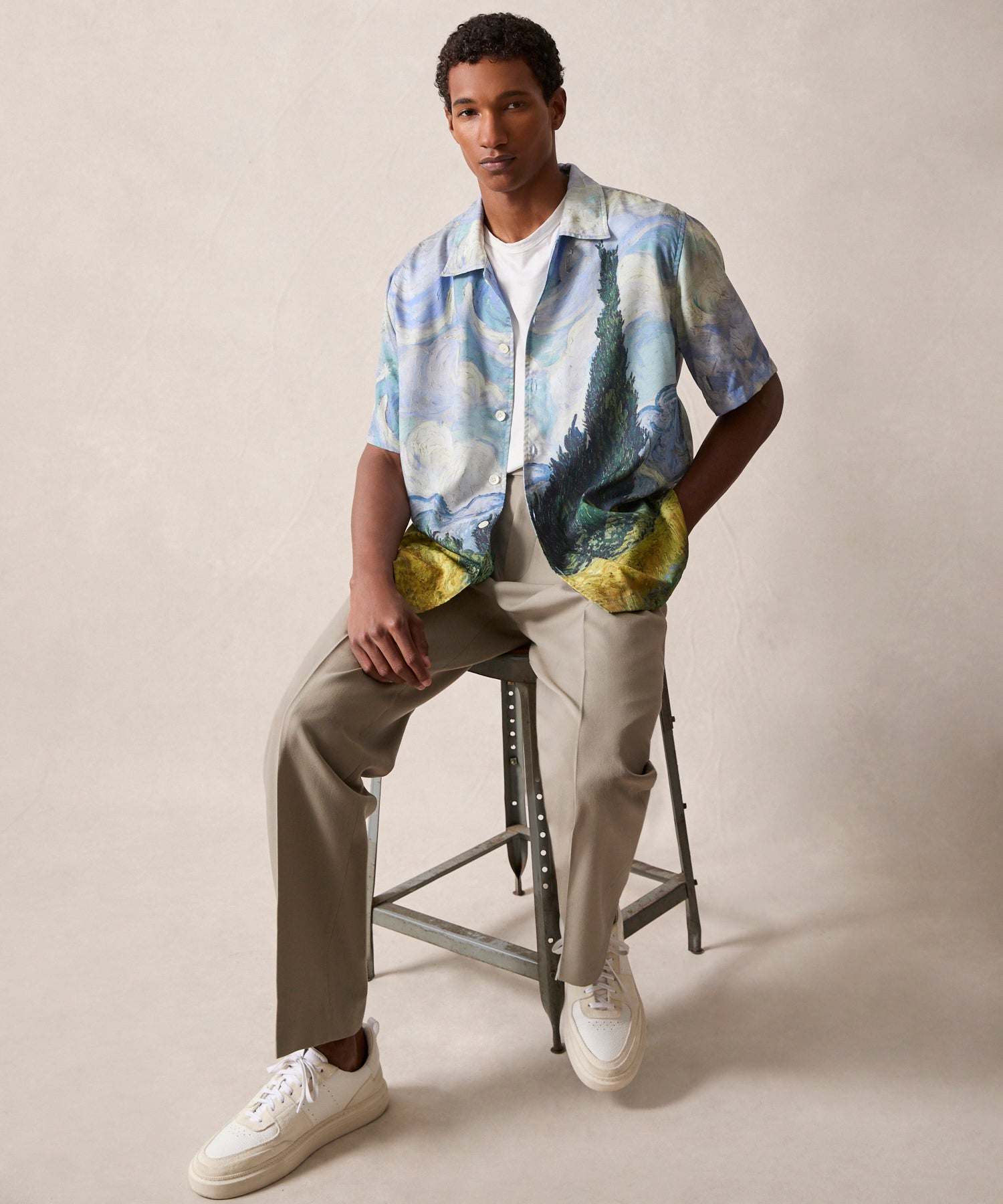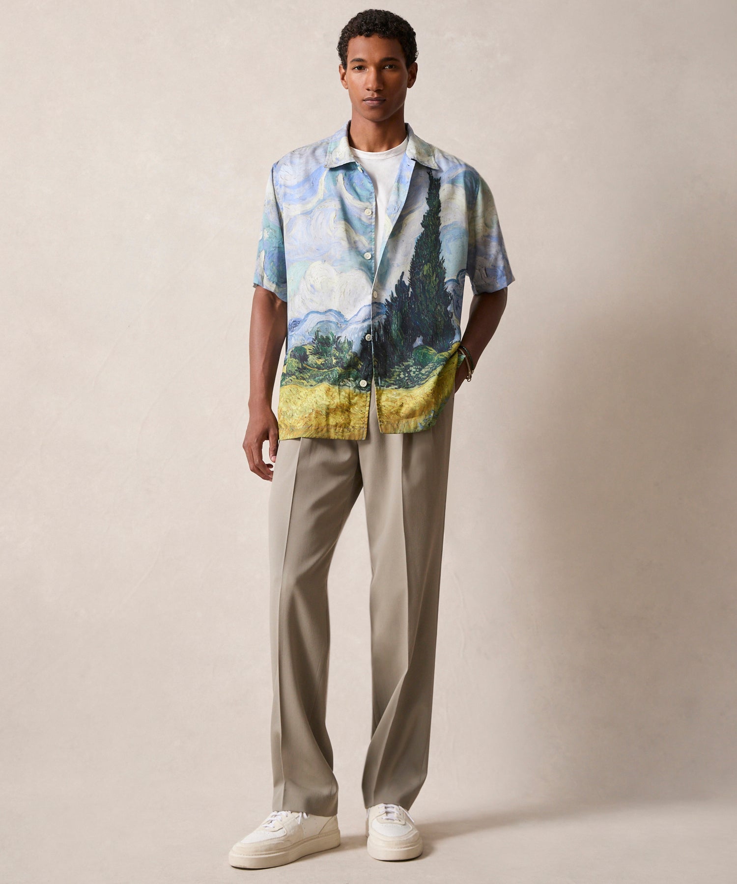 Our classic Camp Collar Shirt gets a unique update in a limited-edition collab with The Metropolitan Museum of Art. Todd’s reimagined the traditional silhouette with a boxier, ever-so-slightly cropped fit and a silky tencel fabric, resulting in a shirt that’s meant to drape well and show off your trousers. The shorter length also serves to balance the collaged print in a chic, modern way. Cypresses began to appear in Vincent van Gogh’s (Dutch, 1853–1890) work in the summer of 1889; he regarded this particular horizontal composition,Wheat Field with Cypresses (1889), as one of his “best” summer landscapes.