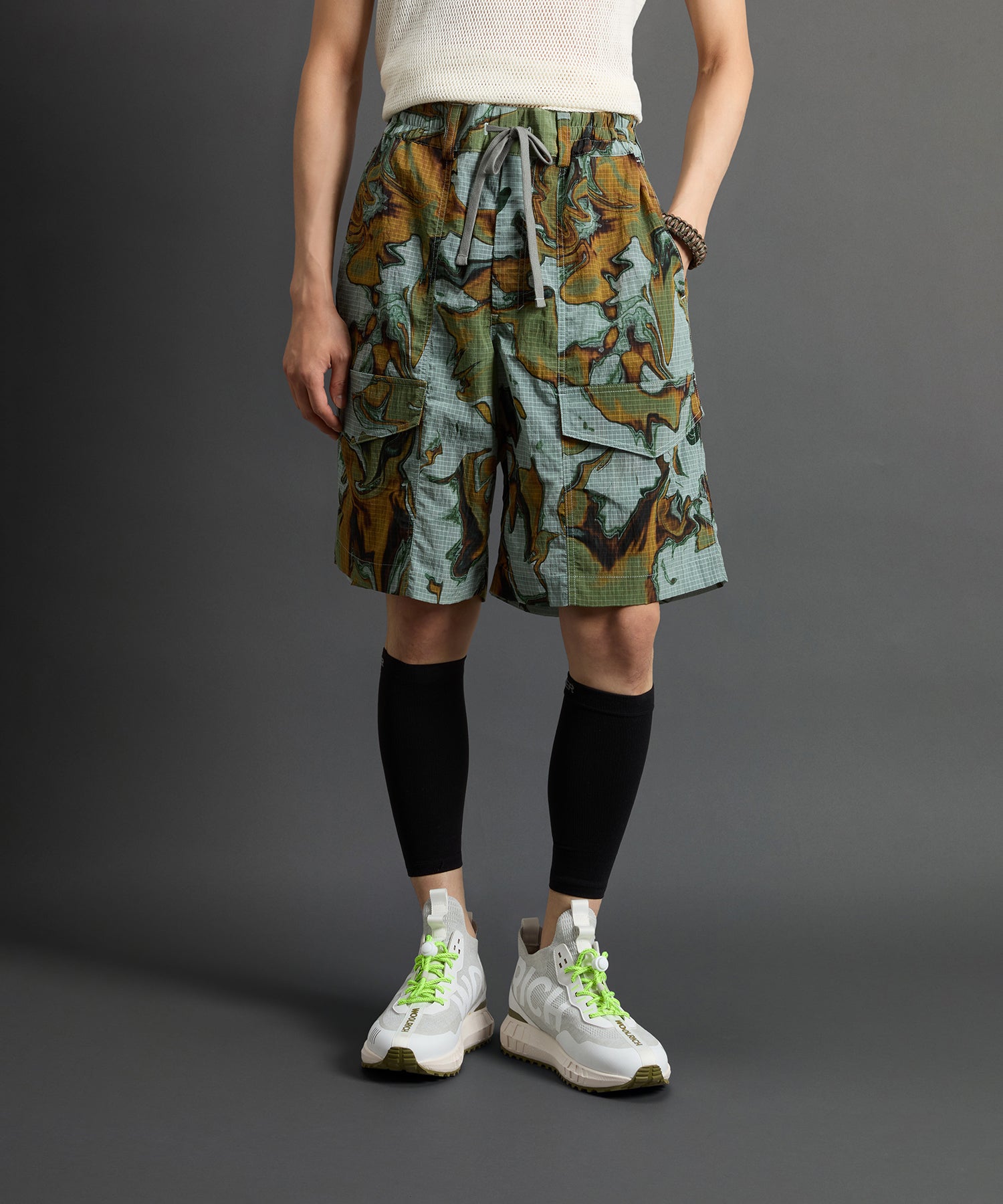 Practical and chic, these Shorts are made from water-repellent Italian ripstop, crafted by the experts at Olmetex, a world-renowned mill established in 1954 in Italy’s Como region. Ripstop is a military innovation, often used in uniforms and parachutes — it’s woven using a special technique that creates a fine crosshatch pattern, making it both lightweight and incredibly resistant to tearing. They’re printed with a unique, tie-dye oil emulsion technique that (unsurprisingly) resembles oil on water, or a heat map. They’re comfortable, too, with a roomy 9” inseam, elastic drawstring waist and easy fit. One extra-special design detail: the “hidden” patch pockets, beneath the cargo pockets.